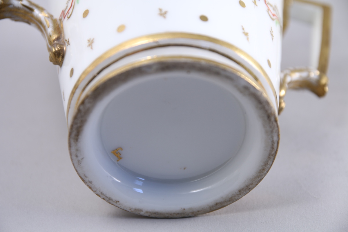 Le pot présente en partie supérieure et à mi-hauteur un décor en frise d'arabesques alternant vases et coupes de fleurs, rinceaux, enroulements, guirlandes de fleurs, un semis de feuilles dorées et de points sur le corps, le talon souligné de filets or et les anses en forme de grecques ornées d'un liseret feuillagé. Marqué F à l'or.