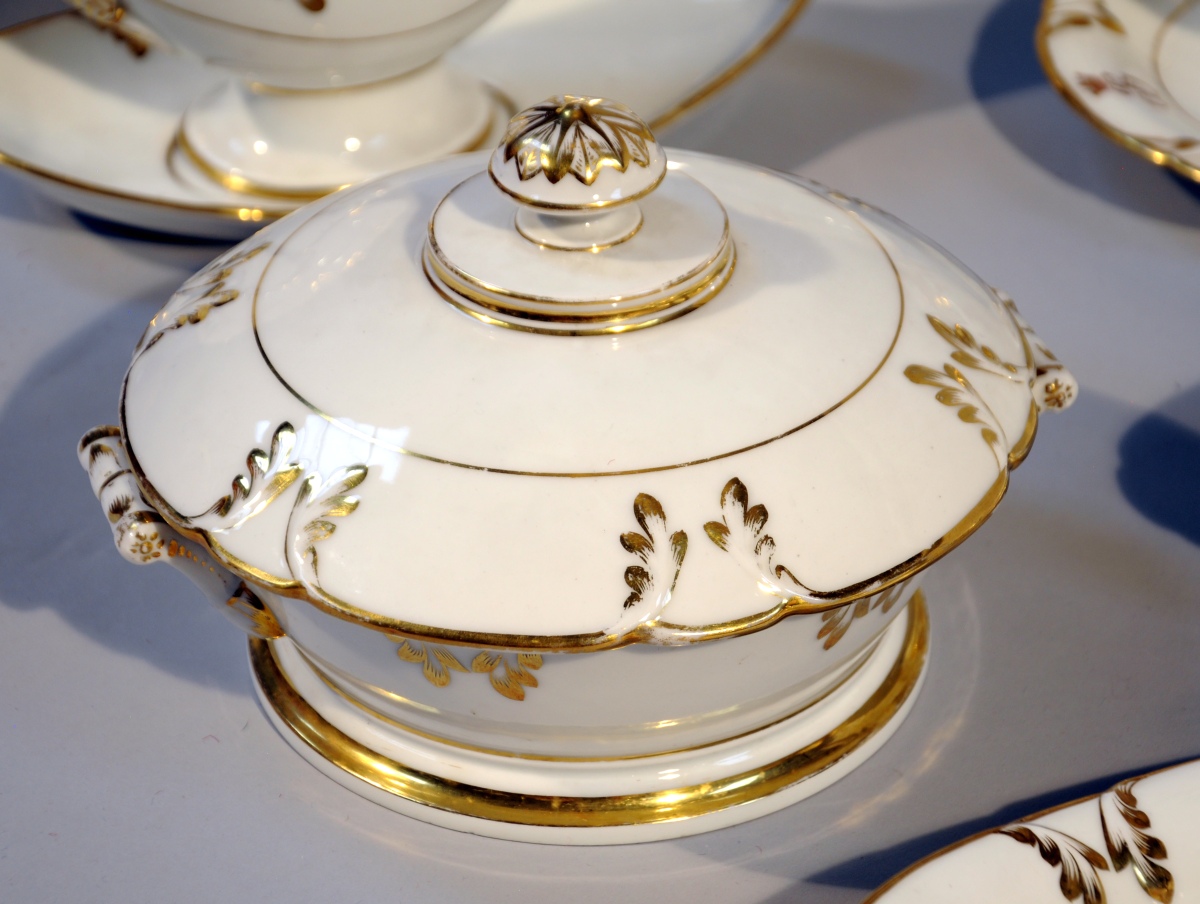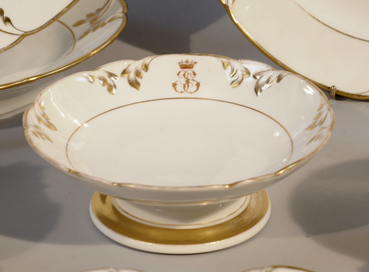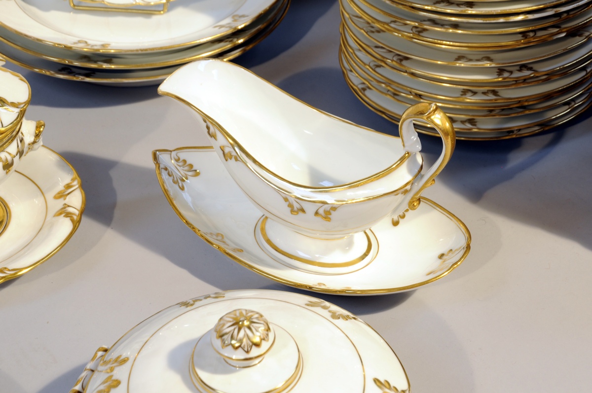 VIEUX PARIS. SERVICE DE TABLE, 119 PIÈCES, en porcelaine dite "Vieux Paris", à décor or sur fond blanc et bordures festonnées. Décor d'agrafes feuillagées. Certaines pièces portent le monogramme "JS" timbré d'une couronne de marquis. Il se compose de 49 assiettes plates, 14 assiettes à soupe, 36 assiettes à dessert, 5 plats ronds, 4 plats ovales, 4 raviers, 2 saucières et leur plateau, 2 légumiers, 2 petits pots-à-oille, une assiette montée.