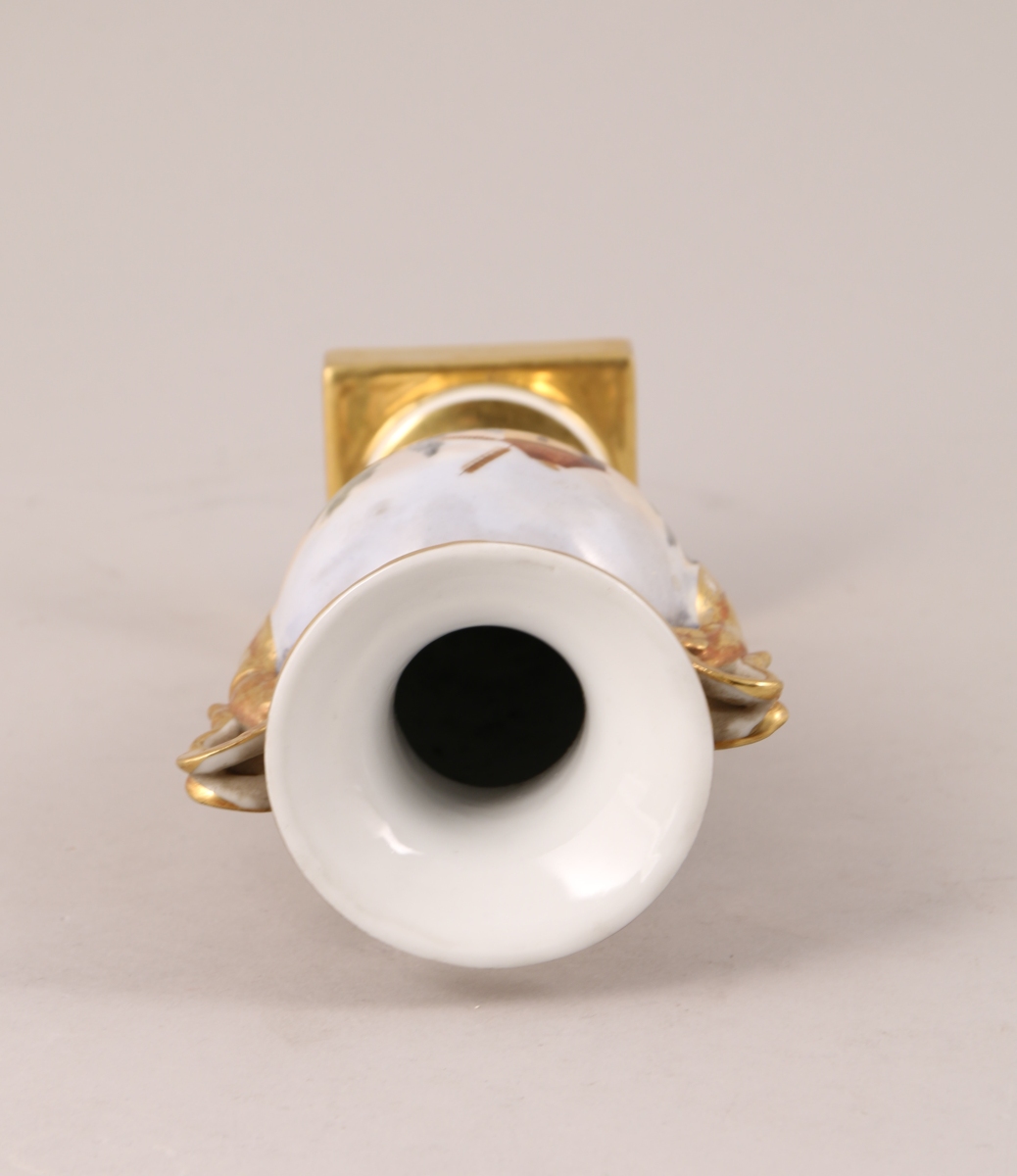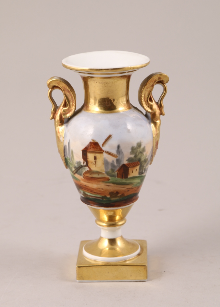 PARIS (?), porcelaine. Petit VASE balustre, anses en forme de cygne. Décor polychrome tournant de paysages lacustres.