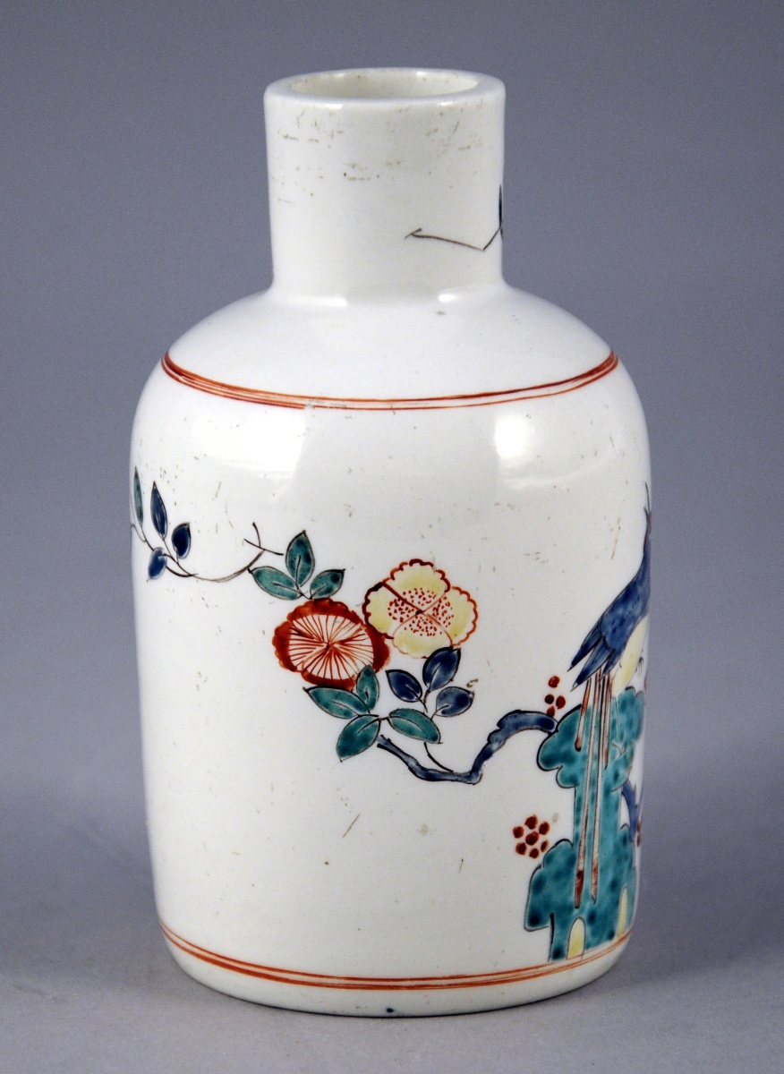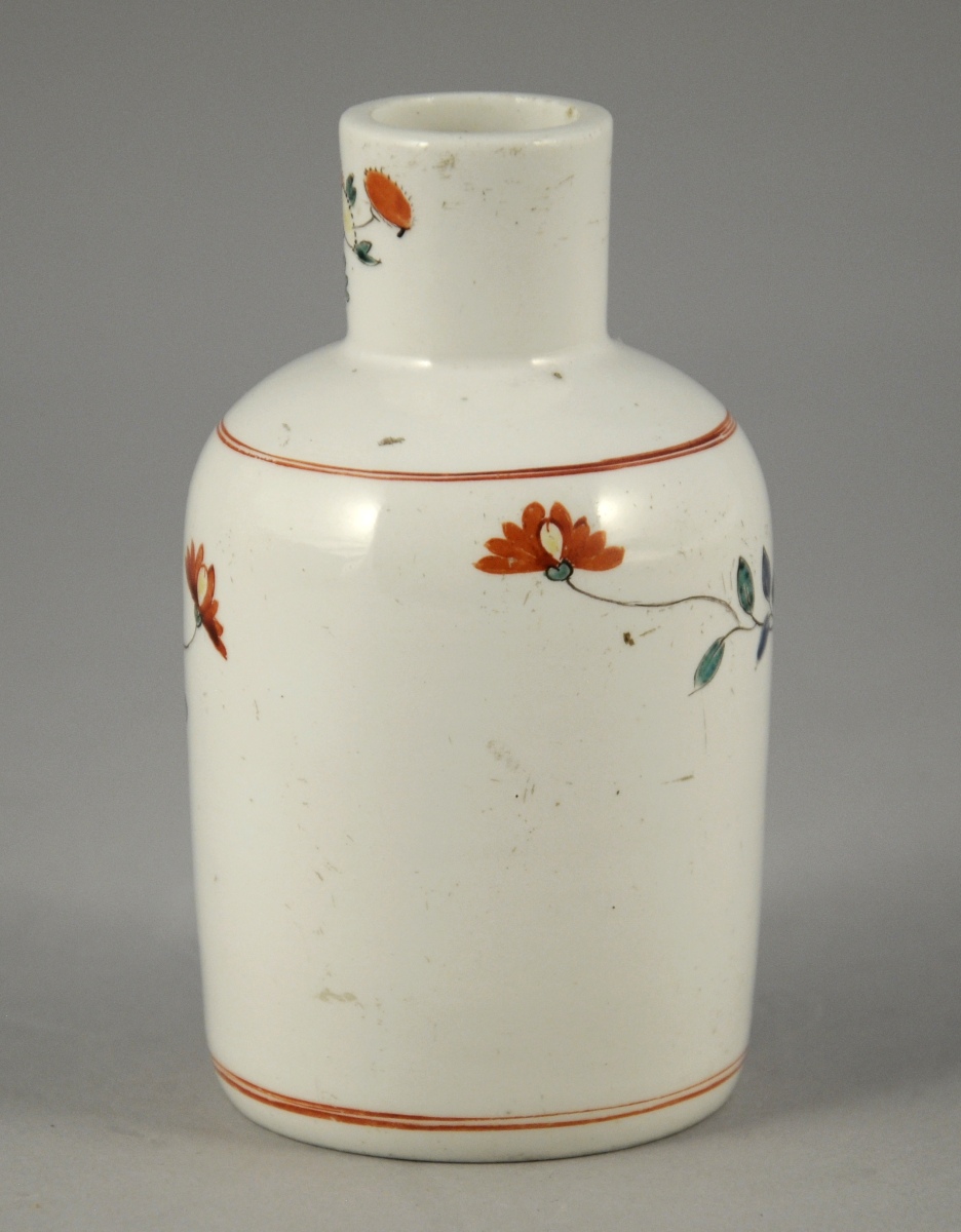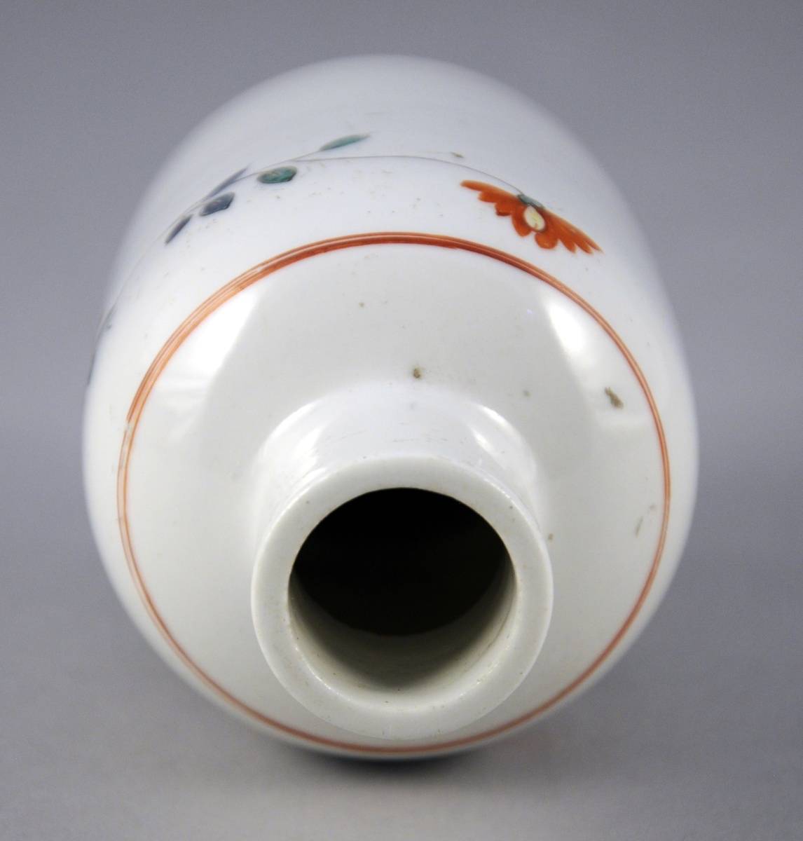 CHANTILLY. Petit FLACON en porcelaine tendre à décor Kakiemon d'un oiseau perché sur un rocher et de branchages fleuris. Double filet en rouge de fer à l'épaulement et à la base. Marque « au cor de chasse » en rouge de fer.