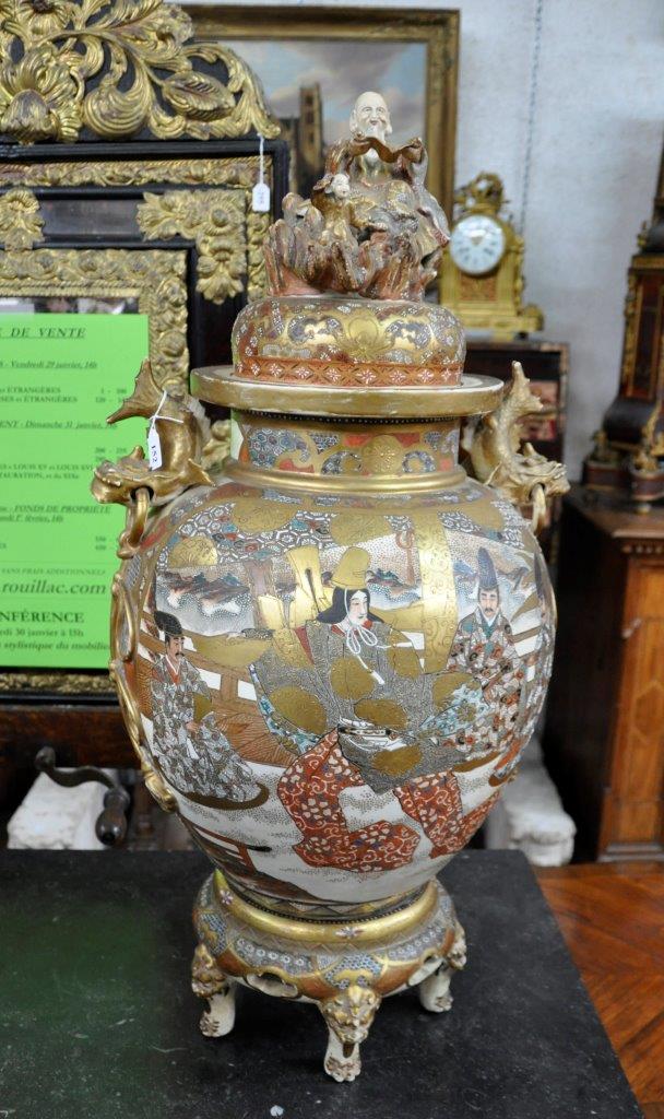 JAPON. Importante potiche en porcelaine à large panse; au riche décor de scène de guerre, et de danse. Anses au monstre marin et passementerie. Elle repose sur un socle à cinq pieds d'animaux. Couvercle au lettré enseignant et enfant.