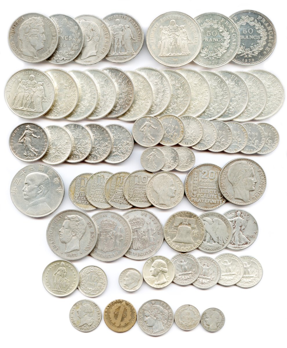 5 Francs Louis Philippe, Napoléon III, IIIe République ; 50 Francs Hercule (3 p.) ; 10 Francs Hercule (13 p.) ; 5 Francs Semeuse (5 p.) ; 1 Franc Semeuse (8 p.) ; 50 centimes Semeuse (3 p.) ; 20 Francs Turin 1933 et 1938 ; 10 Francs Turin (5 p.) . On joint un lot de pièces étrangères en argent de Chine, Espagne; USA, Suisse et 2 pièces Lous XVI (15 sols et 6 deniers) ainsi que 2F et 50c Cérès IIIe République et une 10 centimes Indochine 1937. Le tout.