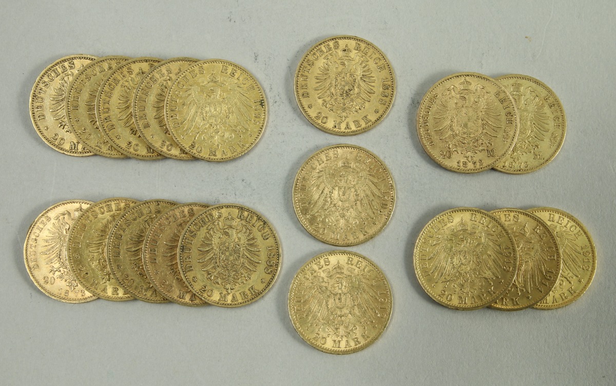 ALLEMAGNE. 18 pièces 20 MARKS or : 2 Jean V Sachsen (1872, 1873), 1 Fréderic II Baden (1912), 1 Otto de Bavière (1895), 1 Karl de Wurtenberg (1873), 3 Guillaume II de Prusse en uniforme ( 2x1913, 1x1914), 5 Fréderic de Prusse (5x1888), 5 Hambourg (1875, 2x1878, 1884, 1895)