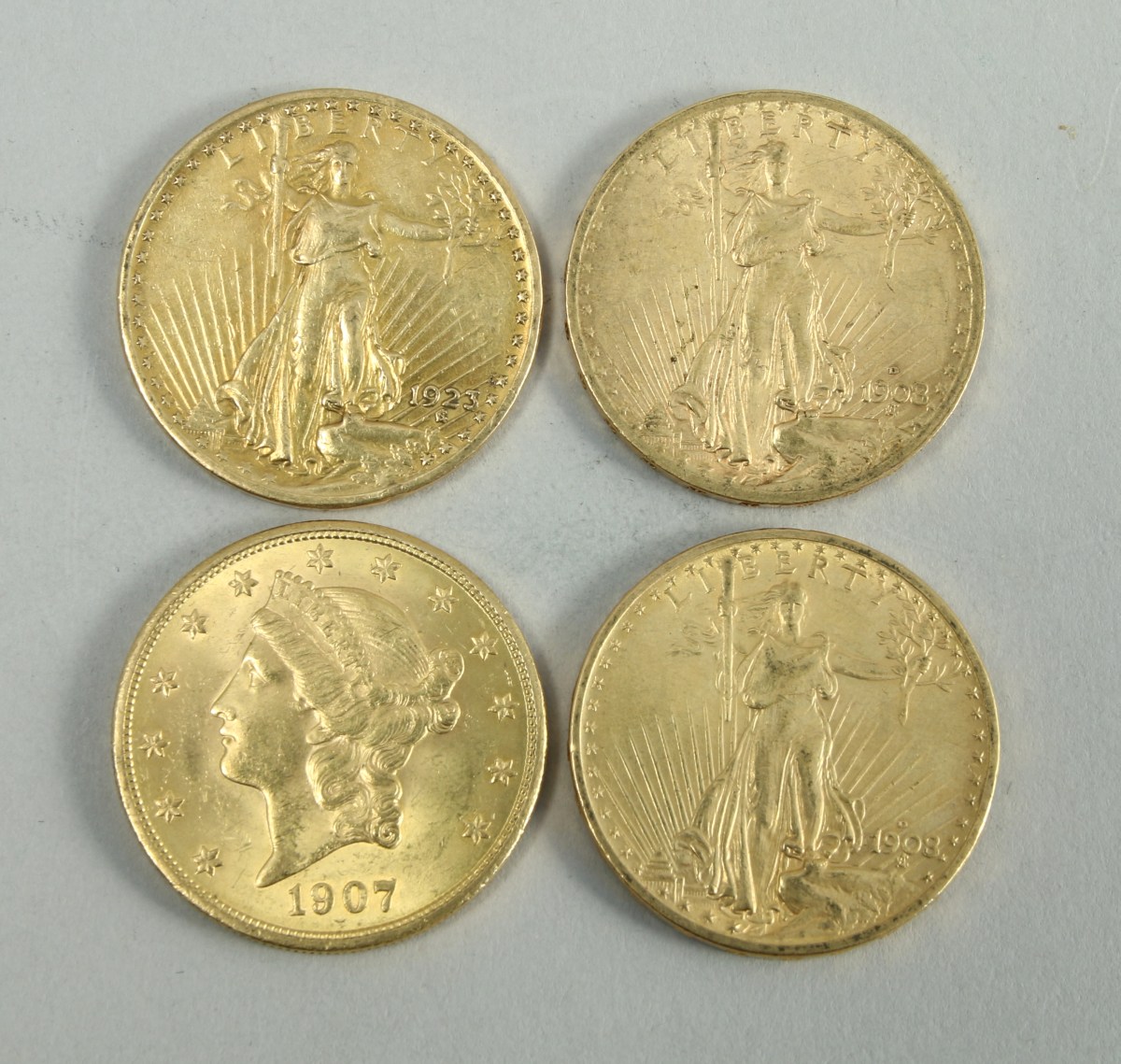ETATS-UNIS. 4 pièces de 20 DOLLARS or. 1907, 1908 (2), 1923.