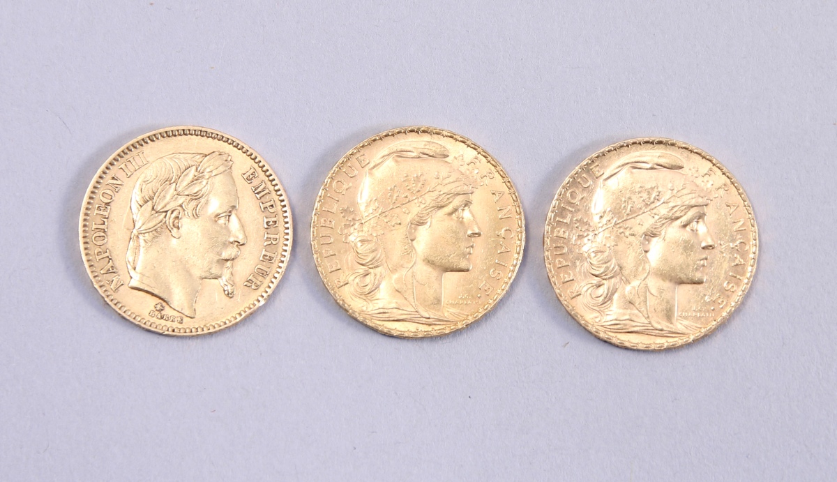 FRANCE. 20 FRANCS or, 3 pièces : Napoléon III lauréé (1865), Coq (1909, 1907).