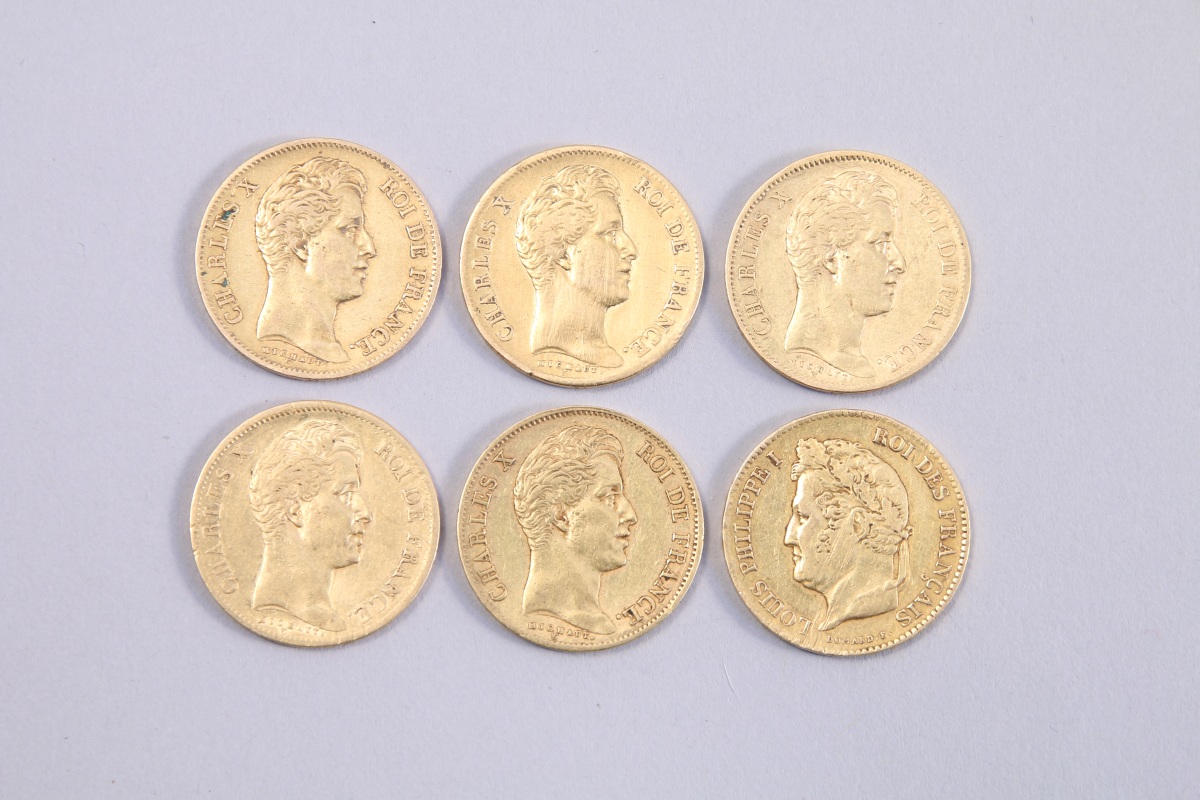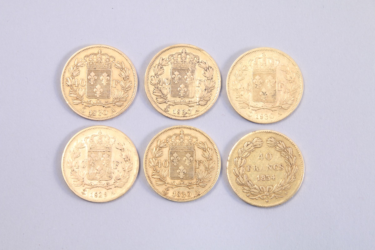 - 5 pièces de 40 francs or, au profil de Charles X tête nue (Paris, 1829, 1830, 1830, 1830)