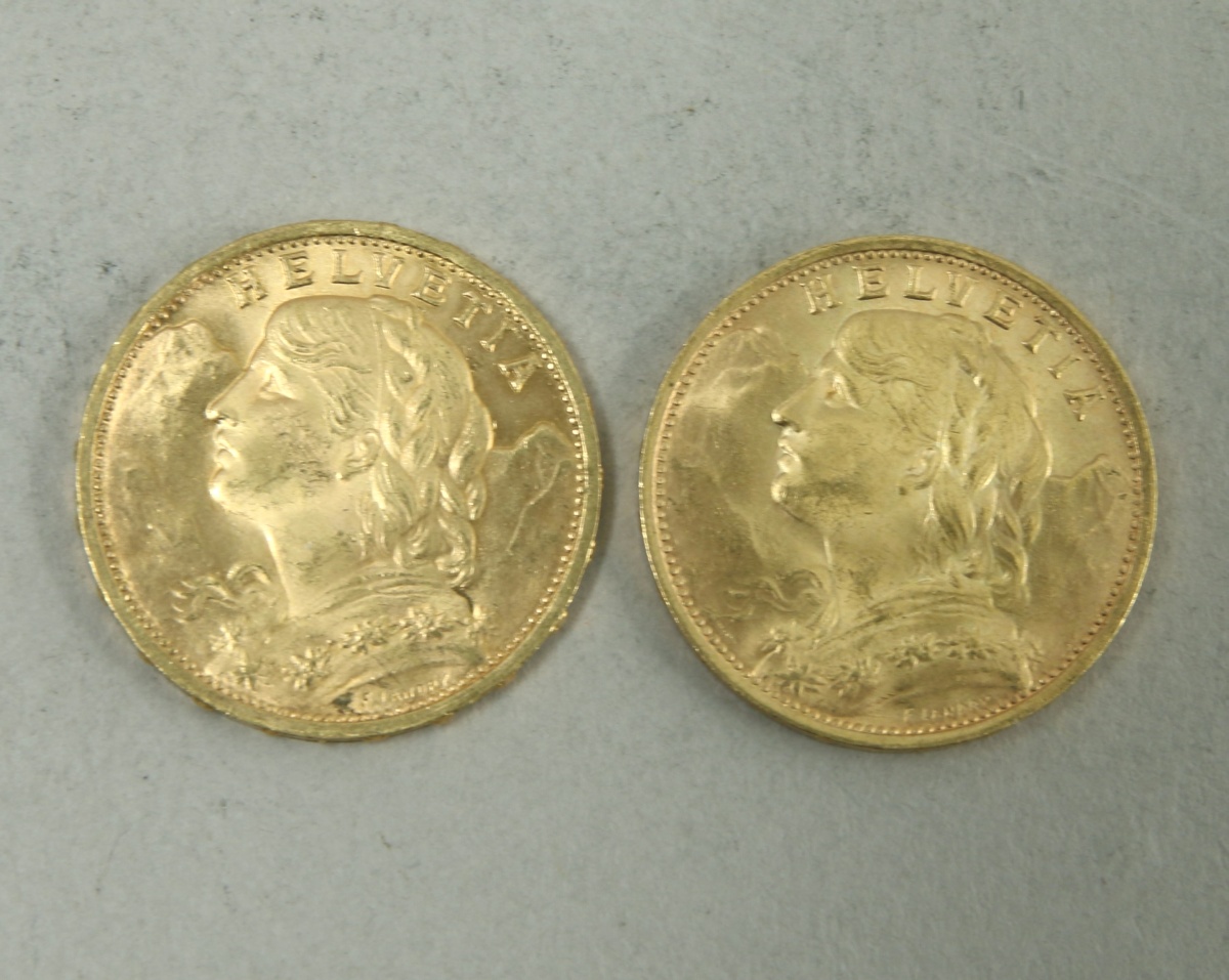 SUISSE. 2 pièces 20 FRANCS or. 1927, 1935.