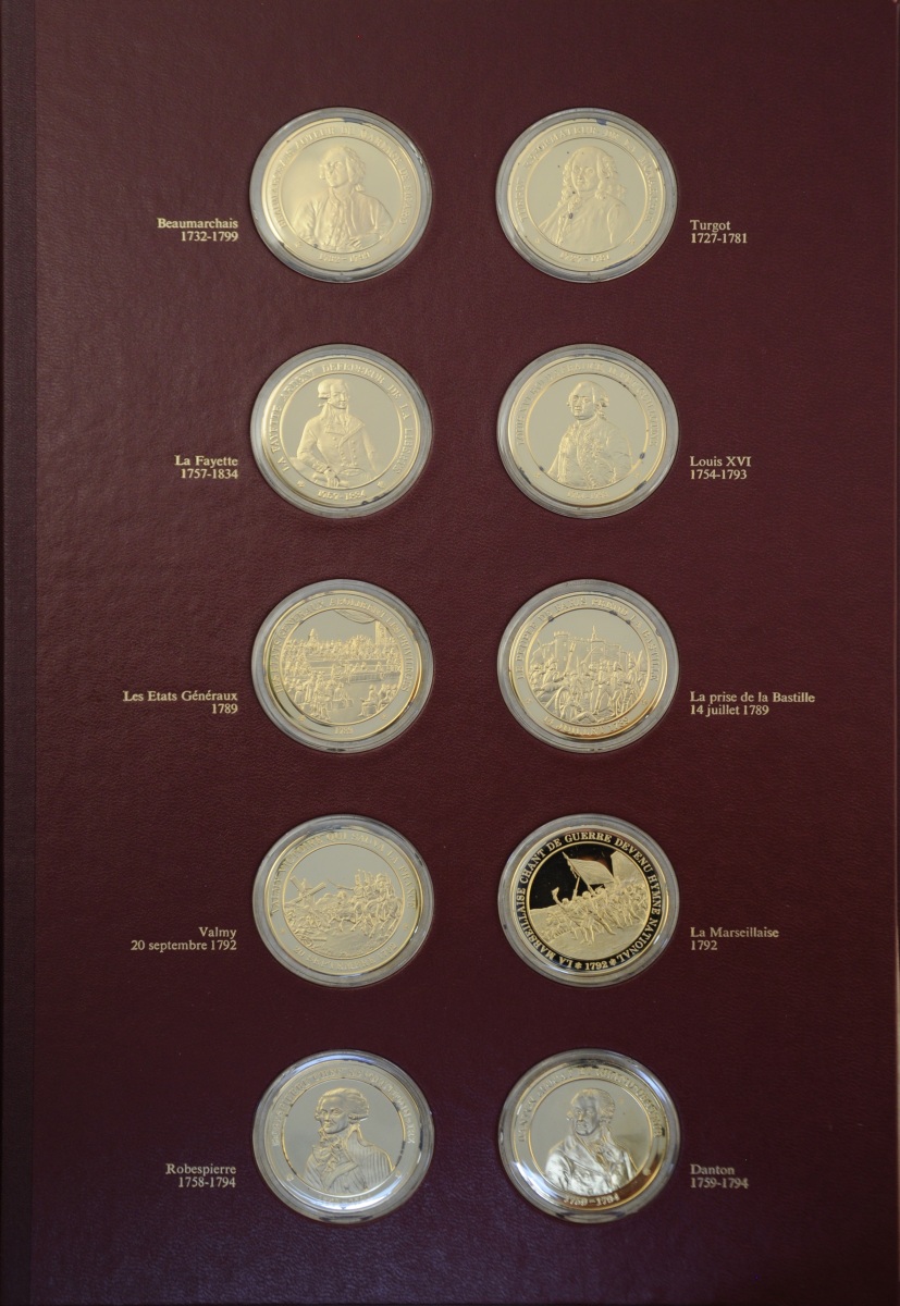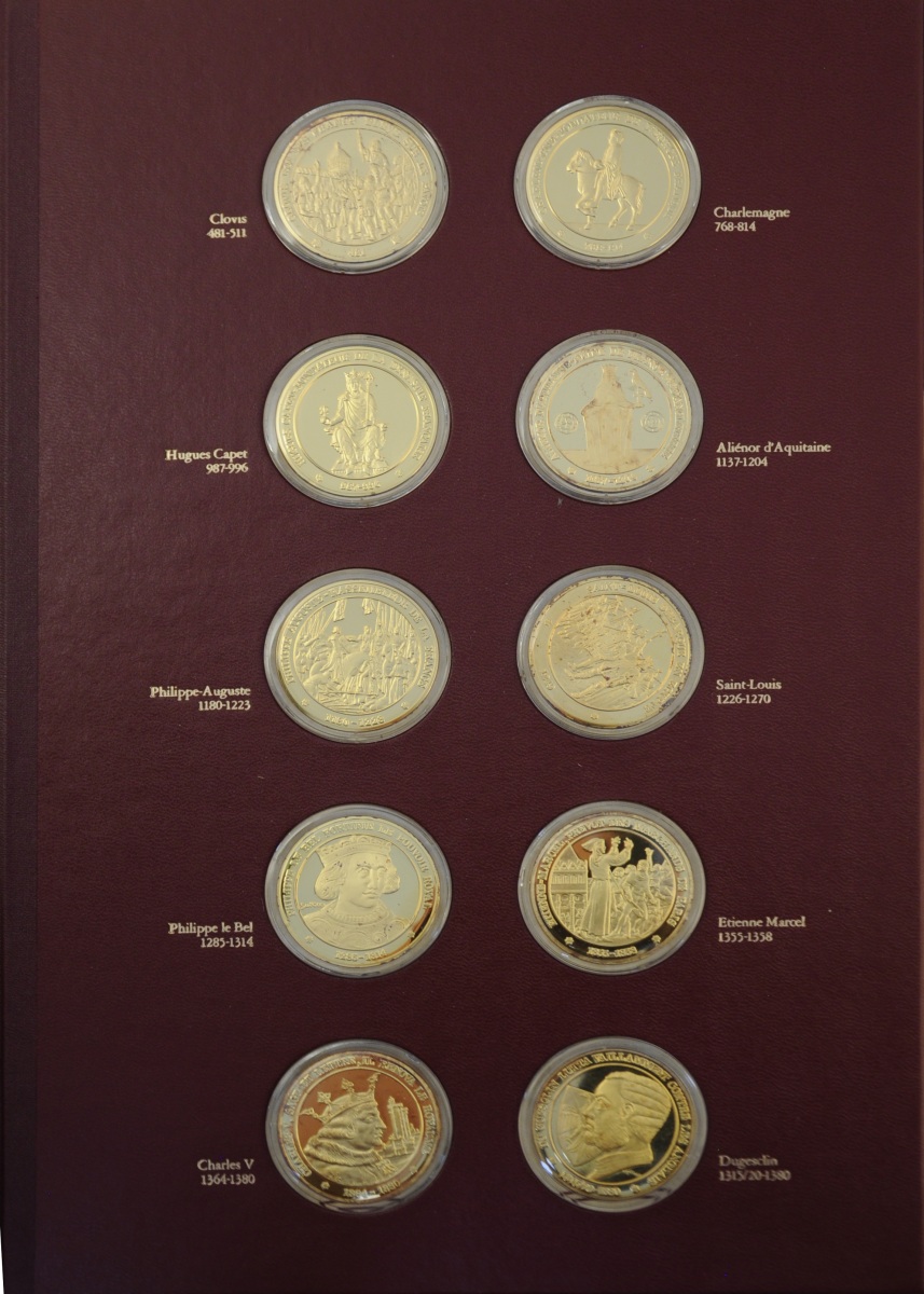 ANCIEN-REGIME. "L'HISTOIRE de FRANCE en MÉDAILLES", Le Médailler, tirage de 1954, Paris. Tome I et II. DEUX ALBUMS comprenant 98 MÉDAILLES en vermeil, Diam. 4,3 cm. Tome I : de Clovis à Jean-Jacques Rousseau, 48 médailles (deux manquantes : Descartes et La Bataille de Fontenoy). Tome II : de Beaumarchais au Traité de Rome, 50 médailles. Poinçon crabe et poinçon d'orfèvre. Certificat d'authenticité signé par Patrick Petit, Président Le Médailler.