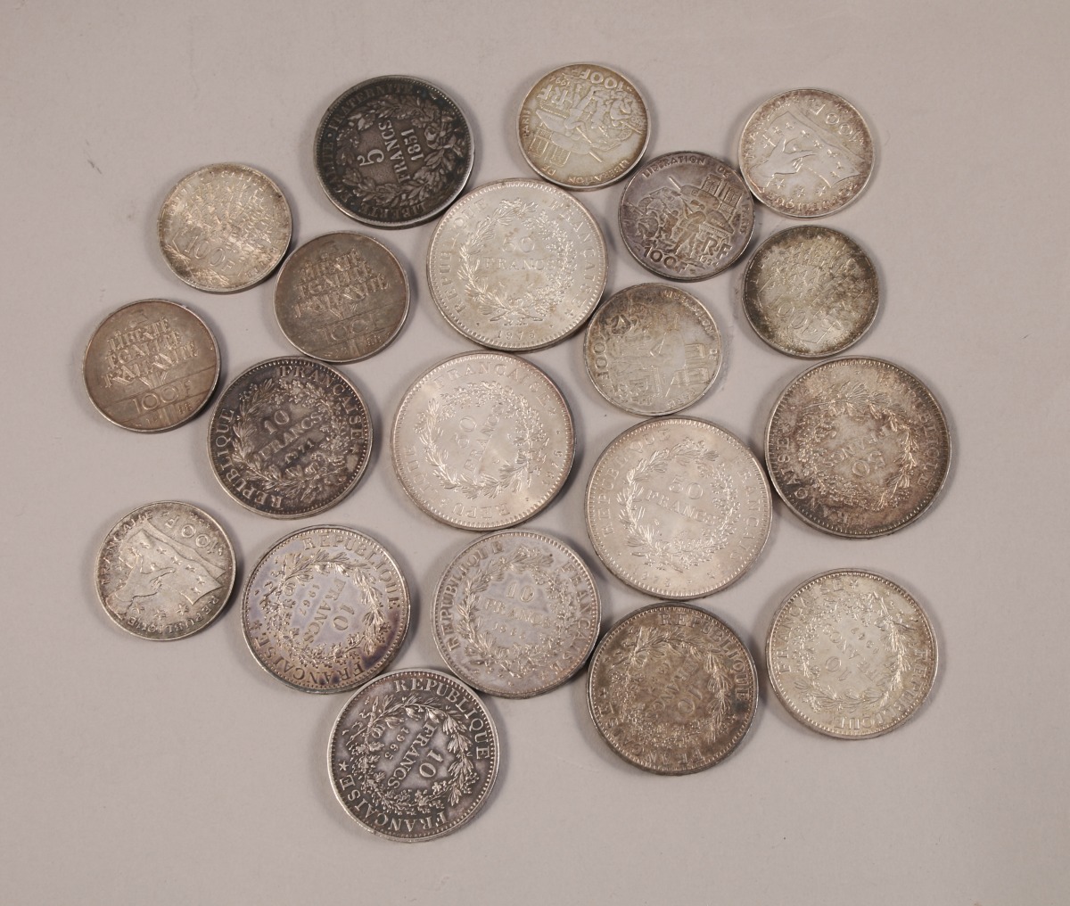 FRANCE. 20 monnaies argent : 5 F x 1 pièce 1851 ; 10 F x 6 pièces 1965 (2), 1967 (3), 1971 (1) ; 50 F x 4 pièces 1975 ; 100 F x 9. pièces.