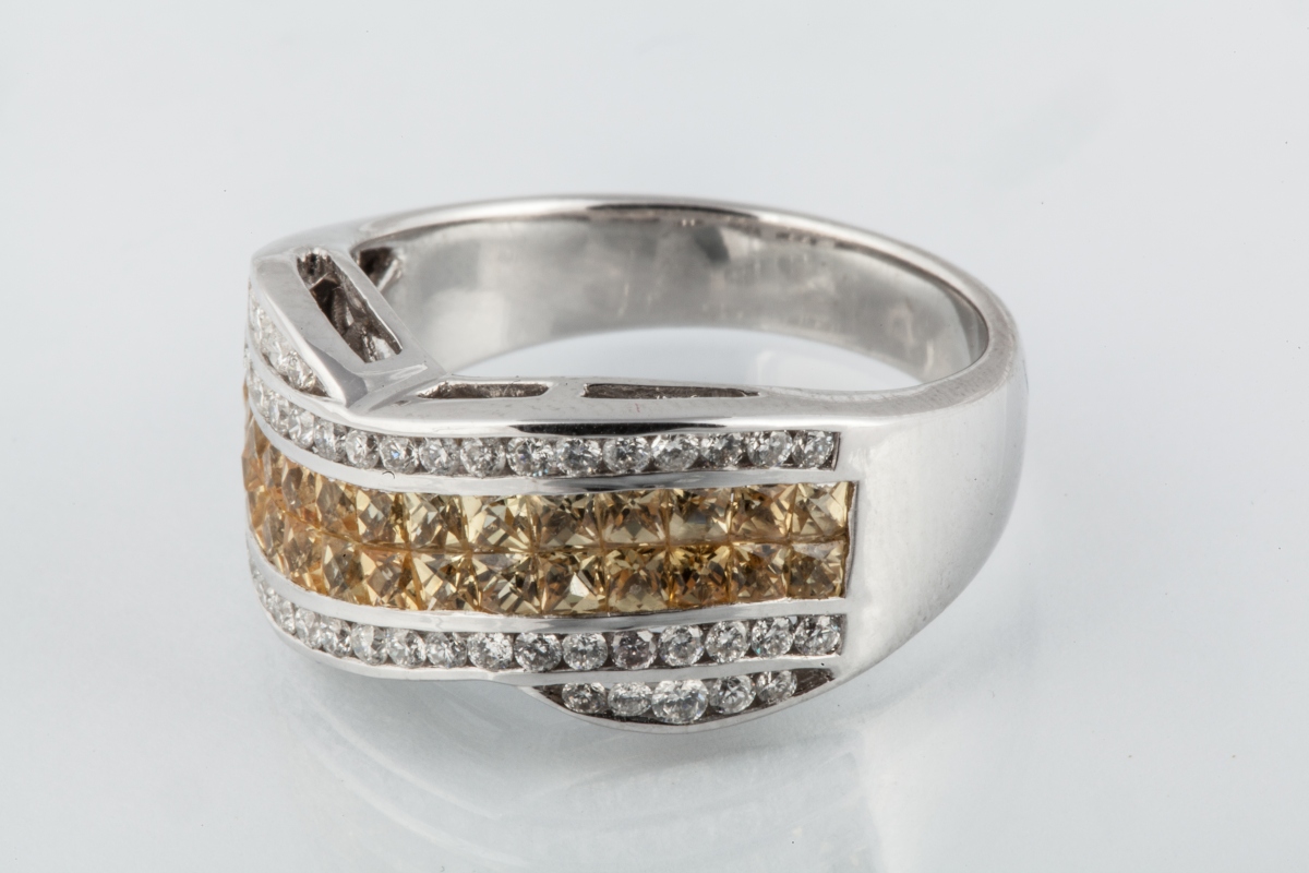 BAGUE de forme chantournée en or blanc sertie de 28 SAPHIRS JAUNES calibrés de 2,70 carats environ et de 46 diamants blancs taille moderne de 0.45 carat environ.