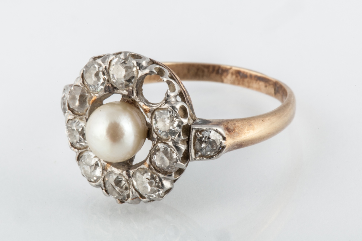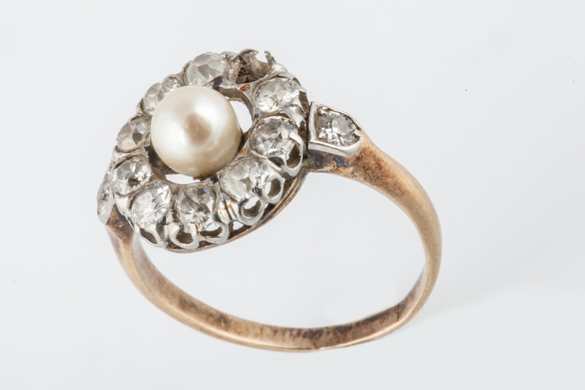 BAGUE MARGUERITE en or jaune et platine (?). Le chaton centré d'une perle dans un entourage de 9 diamants taille ancienne et flanqué de deux autres diamants à l'épaulement.