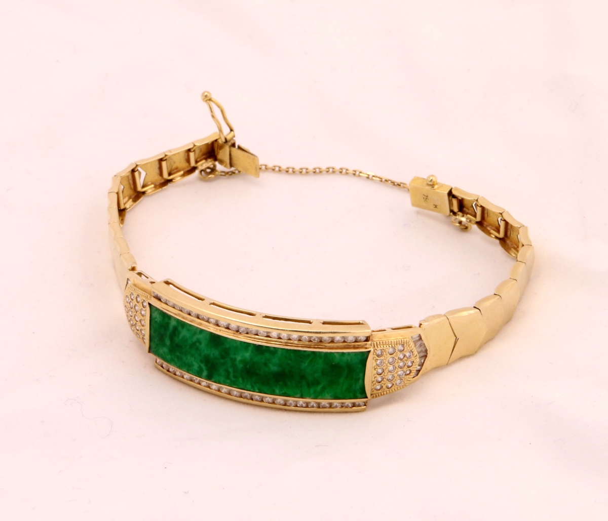 BRACELET en or jaune à mailles serpent, orné d'une plaque en pierre verte (jade ?) dans un entourage de diamant. Poinçon 750.