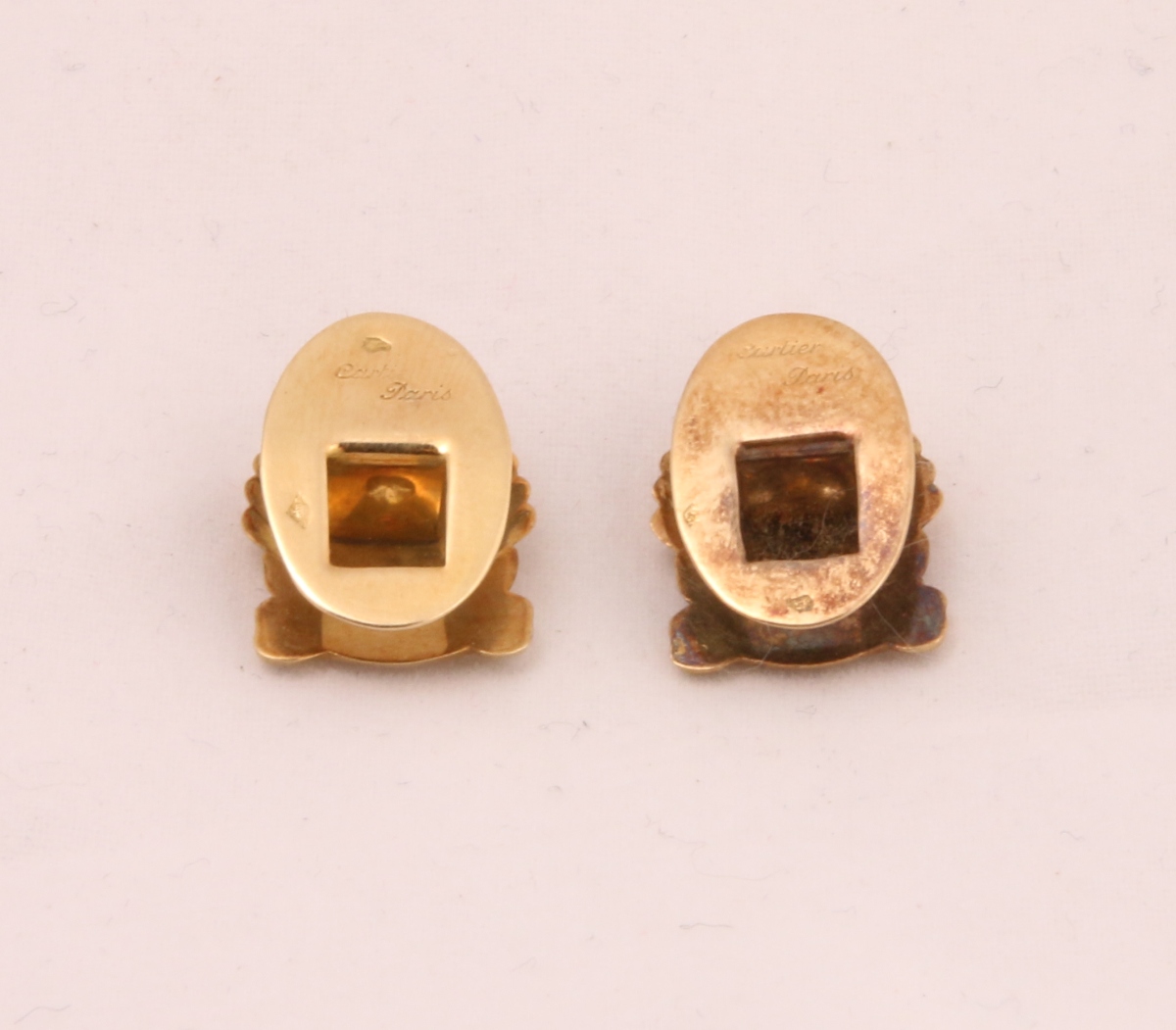 CARTIER. Paire de BOUTONS DE COL en motif de coquille, le premier marqué "25 ans" orné d'un diamant, le second marqué "30 ans" orné de deux diamants. Signés "Cartier Paris".