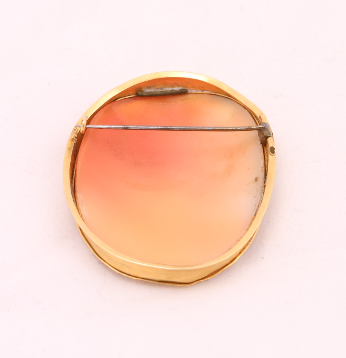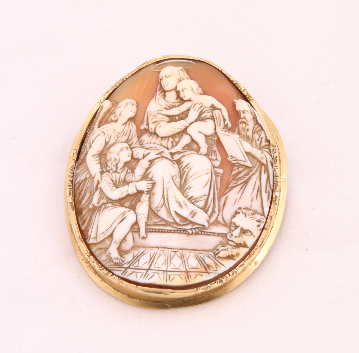 CAMÉE coquille de forme ovale figurant une Vierge à l'Enfant en majesté. Un ange et un enfant tenant un poisson à sa droite, saint Marc, un lion à ses pieds, à sa gauche. Monture en or jaune.
