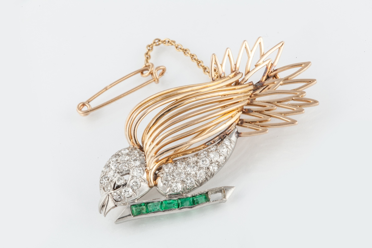 BROCHE OISEAU en or jaune et en or blanc pavé de diamants et ornée d'éméraudes de taille carrée (manque une petite éméraude). Chainette de sécurité.