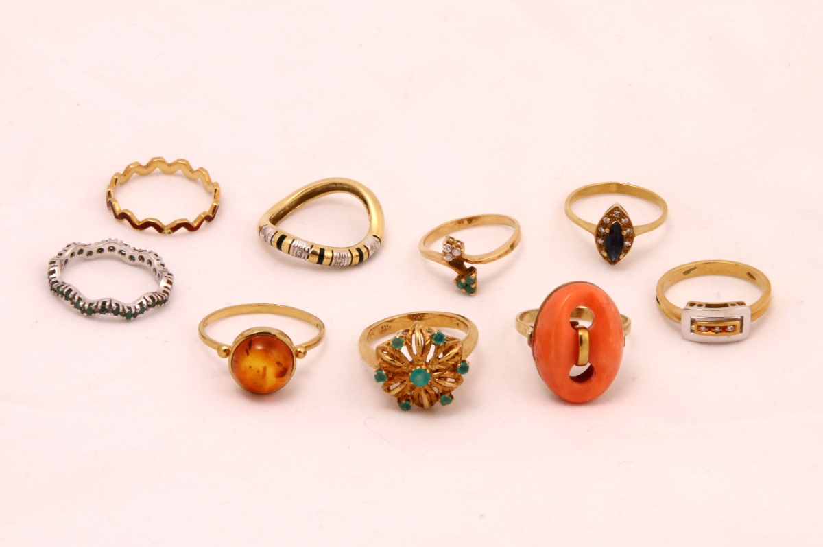 9 BAGUES en or blanc ou jaune 18k serties de pierres précieuses ou semi-précieuses.
