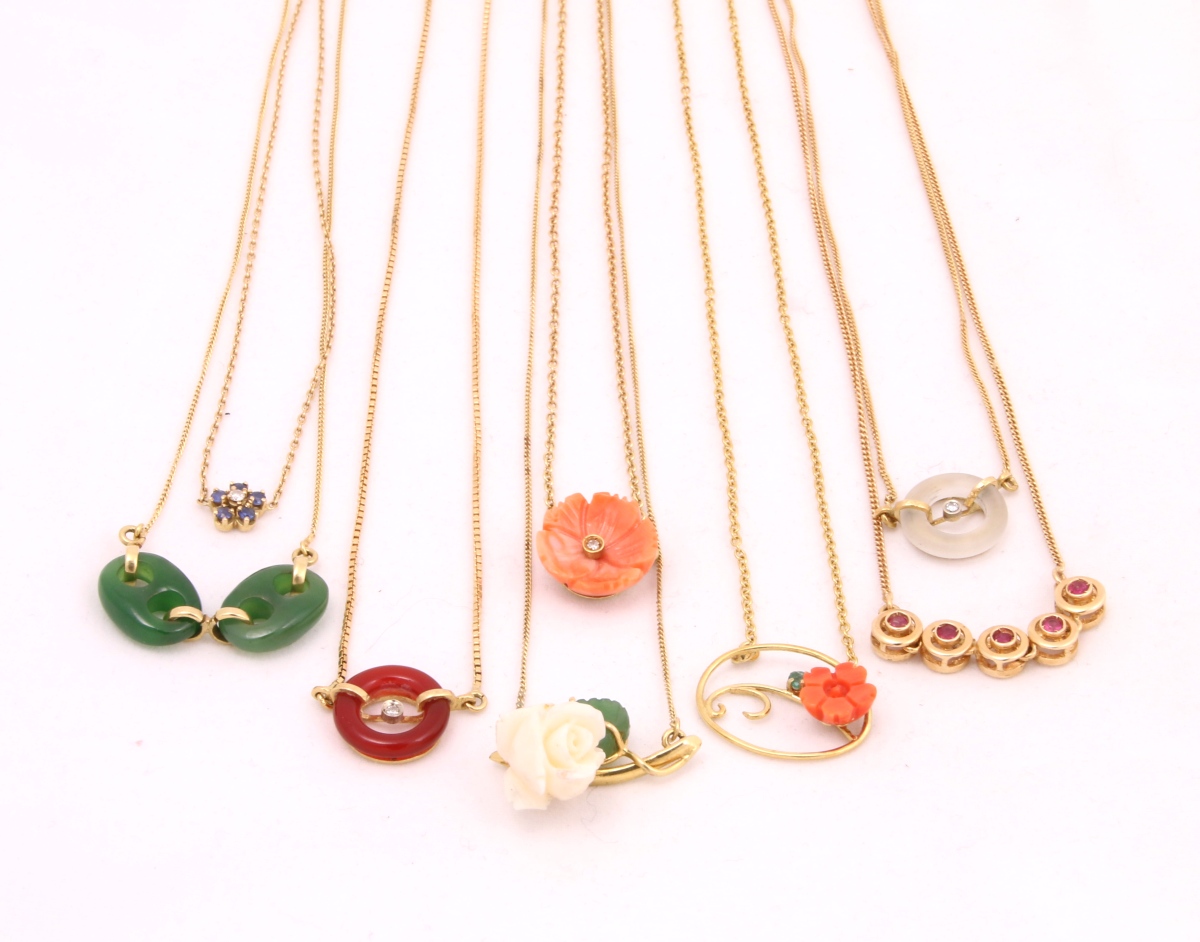 8 COLLIERS, mailles diverses, en or jaune 18k, centrés d'un ornement serti de pierres précieuses ou semi-précieuses.