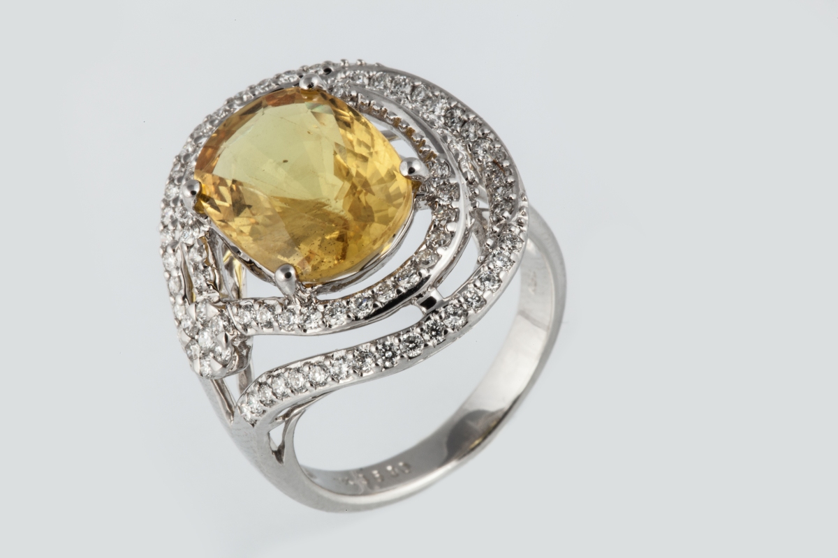 BAGUE de forme ovale en or blanc ajouré. Elle est centrée d'un SAPHIR JAUNE taille ovale de 6,10 carats envrion dans un double entourage de 85 diamants blancs taille moderne de 0,70 carat environ.