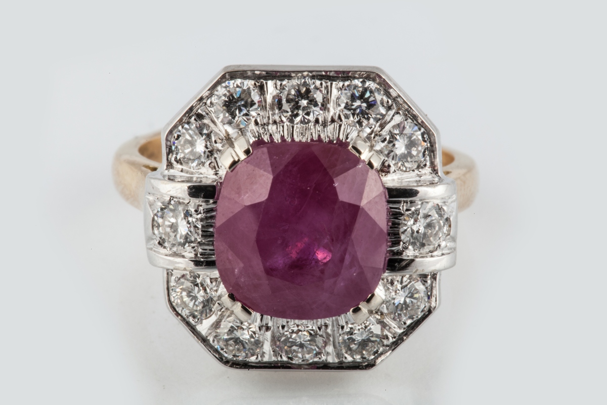 BAGUE de forme rectangulaire à pans coupés en or de deux tons centrée d'un RUBIS (probablement Birman) taille coussin de 4,90 carats environ entouré de 12 diamants blancs taille moderne de 1 carat environ.
