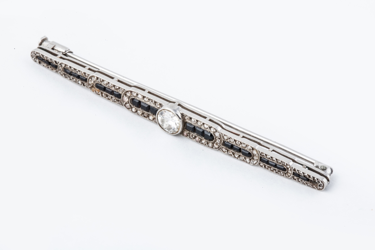 ÉPINGLE en or blanc ou platine, sertie d'un diamant taille central encadré par huit boucles de 24 petits saphirs cerclées de brillant.
