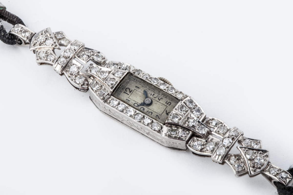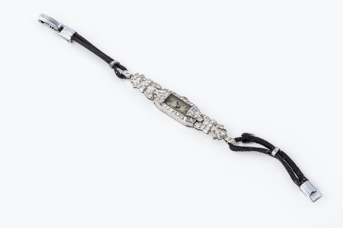 JOINT : MONTRE BRACELET de dame en or blanc ou platine, le boitier et l'amorce du bracelet serti de brillants. Le cadran marqué des heures en chiffres arabes. Bracelet élastique.