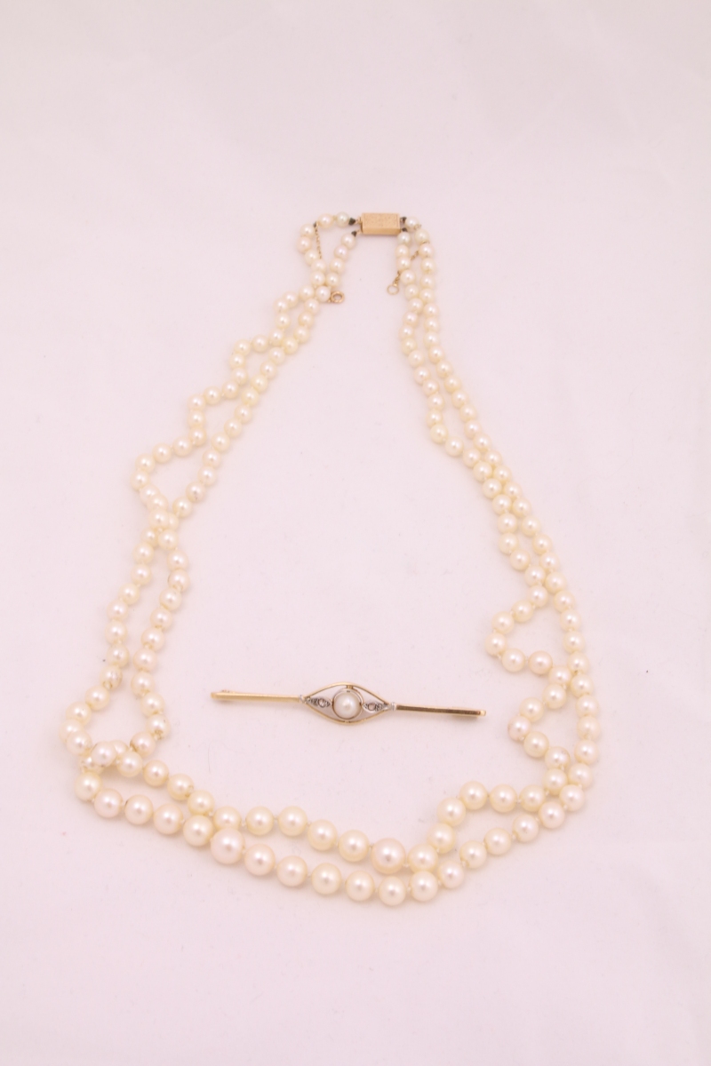 COLLIER deux rangs de quatre-vingt-sept et quatre-vingt-douze perles de culture en chute, le fermoir de forme rectangulaire en or jaune 18K.