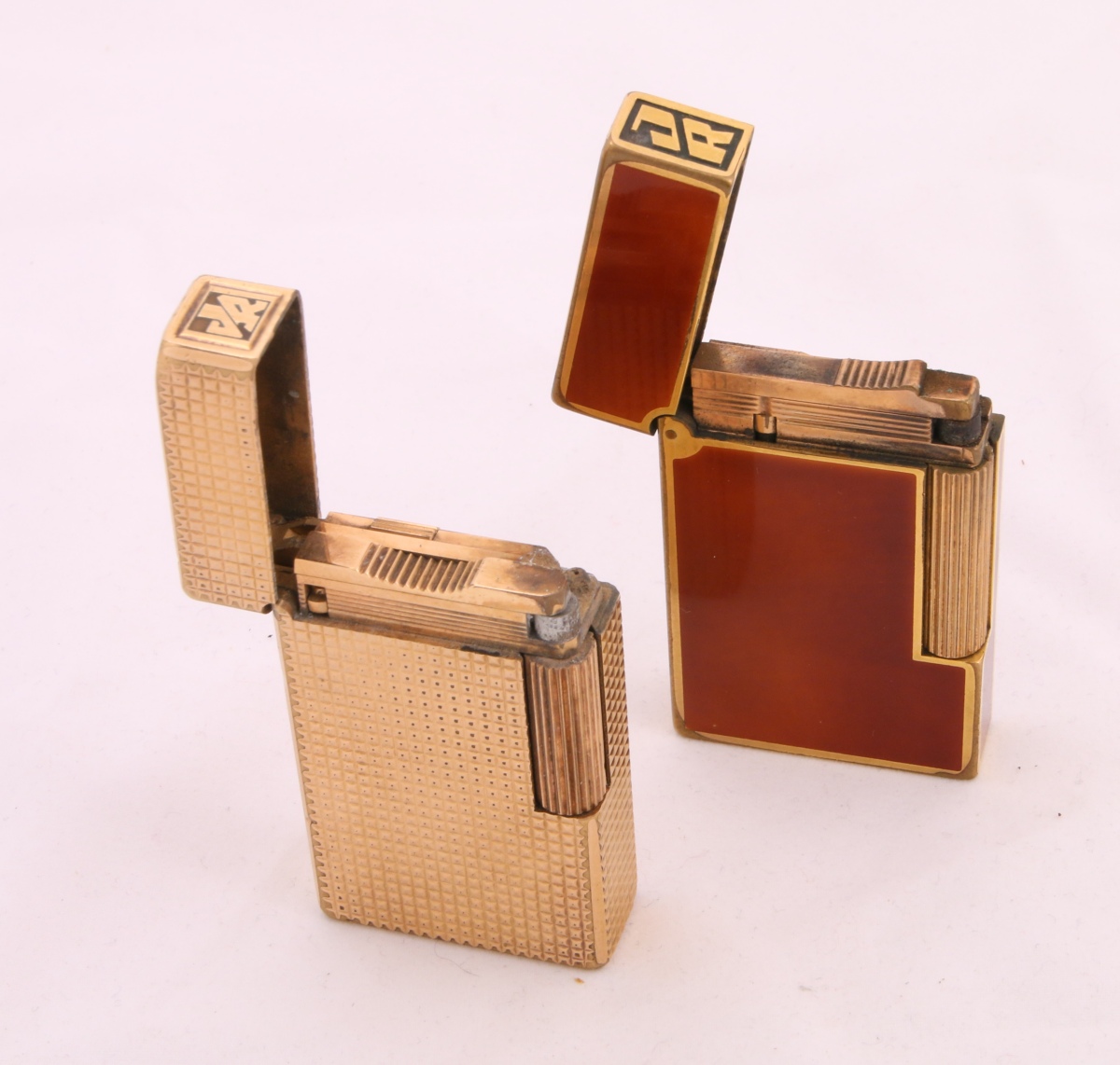 DUPONT. 2 BRIQUETS, l'un en métal doré guilloché et l'autre en laque fauve (accidents).