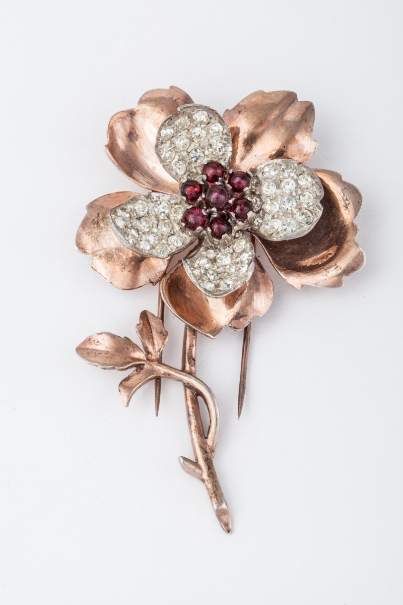 BROCHE en vermeil, argent doré en forme de fleur ornée de pierres blanches et rouge dans le pistil.
