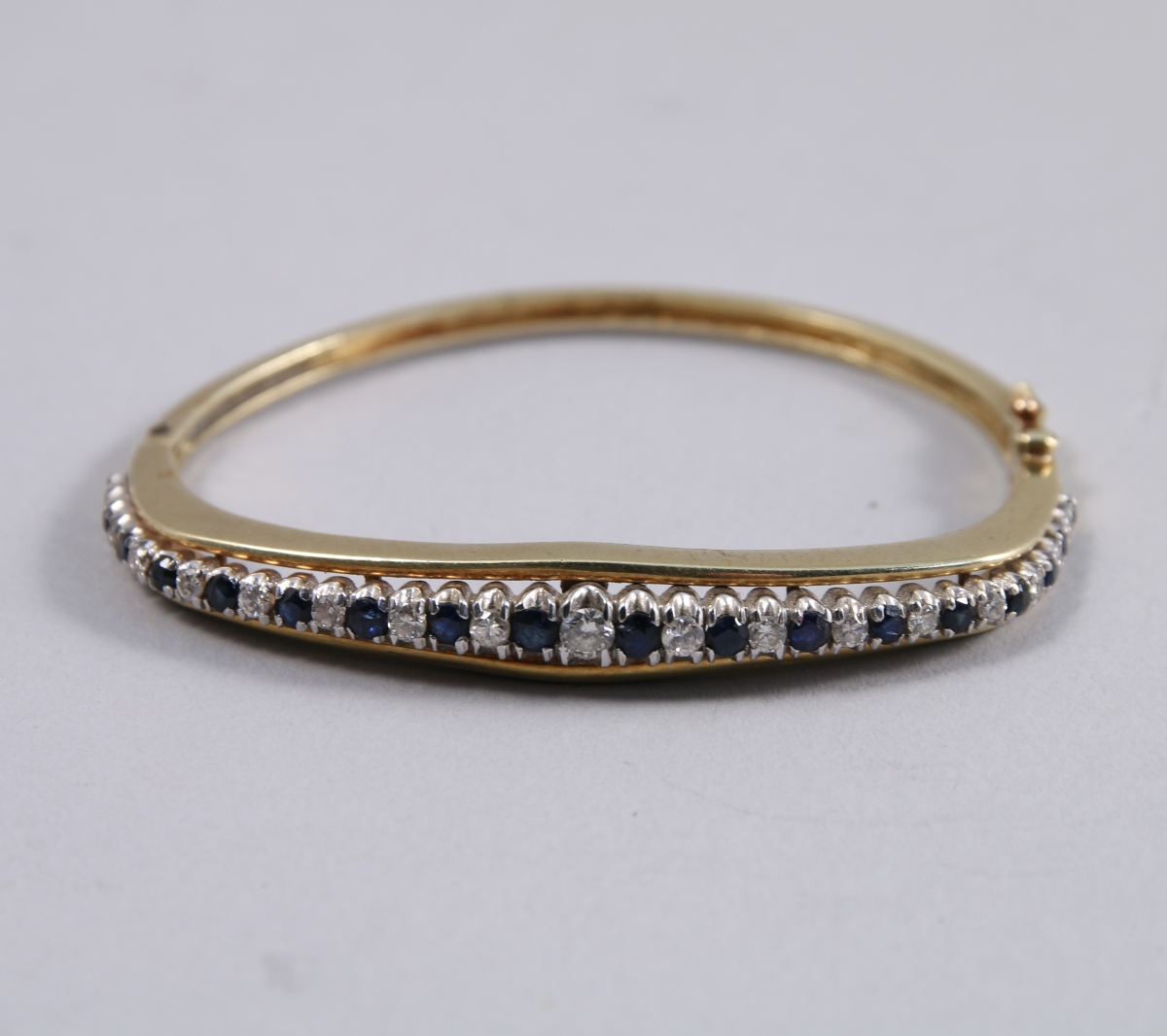 BRACELET rigide en or jaune serti en chute de 17 diamants en alternance avec 18 saphirs. Griffes en or blanc ou platine.