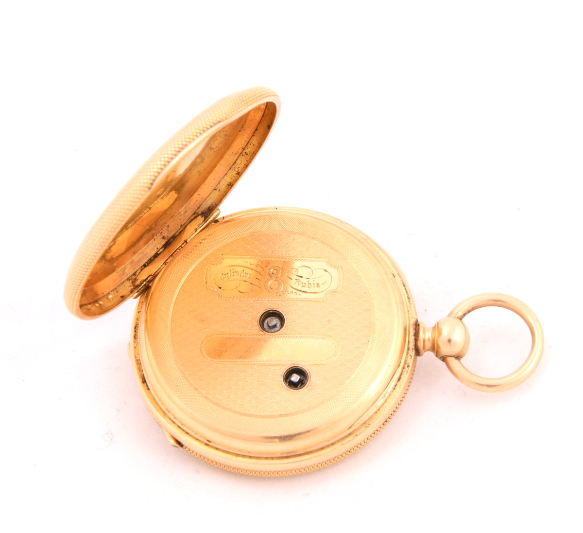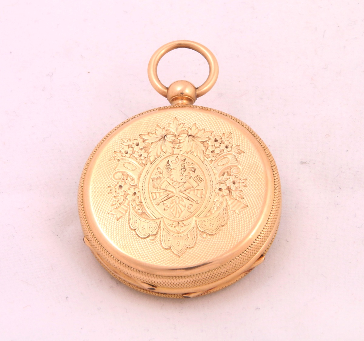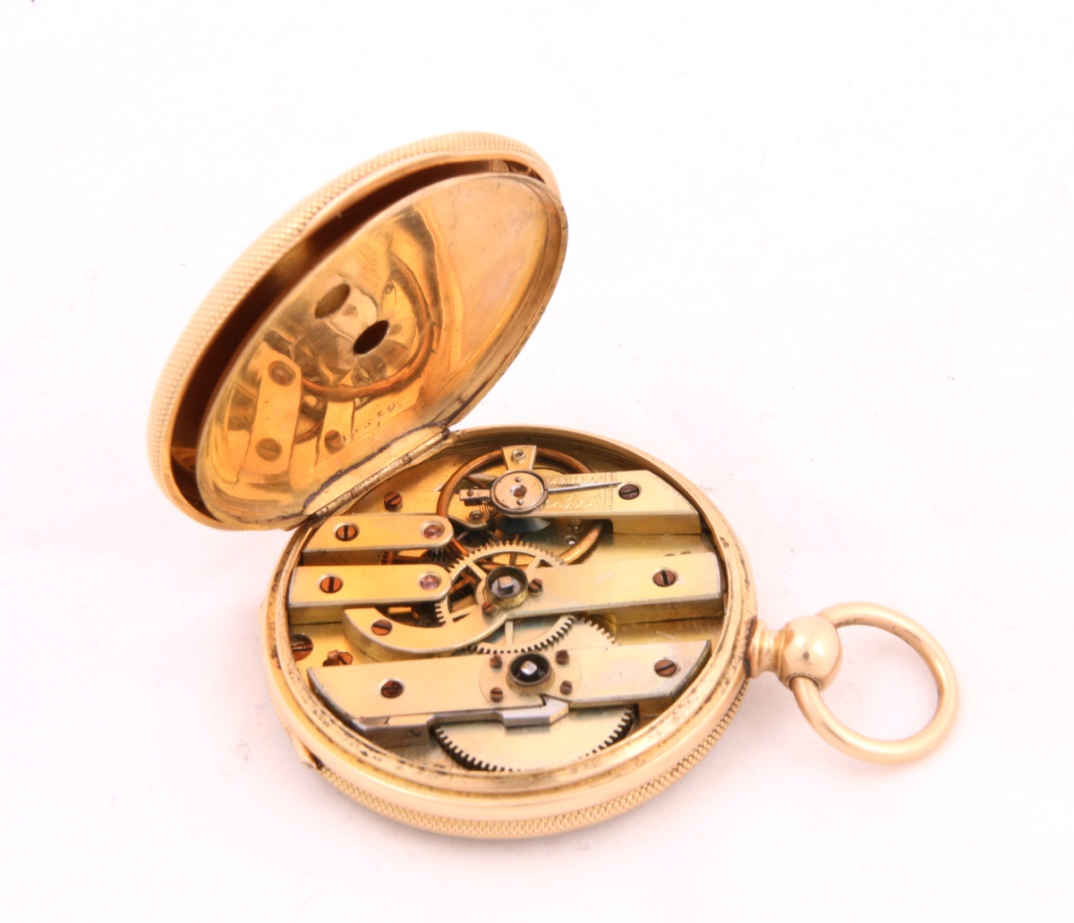 MONTRE de GOUSSET en or jaune, le boîtier guilloché et orné d'un cartouche avec un oiseau au carquois. Le cadran émaillé indique les heures en chiffres romains, gradué pour les mintutes, chaque période de 5 minutes en chiffres arabes. Remontage à clé.