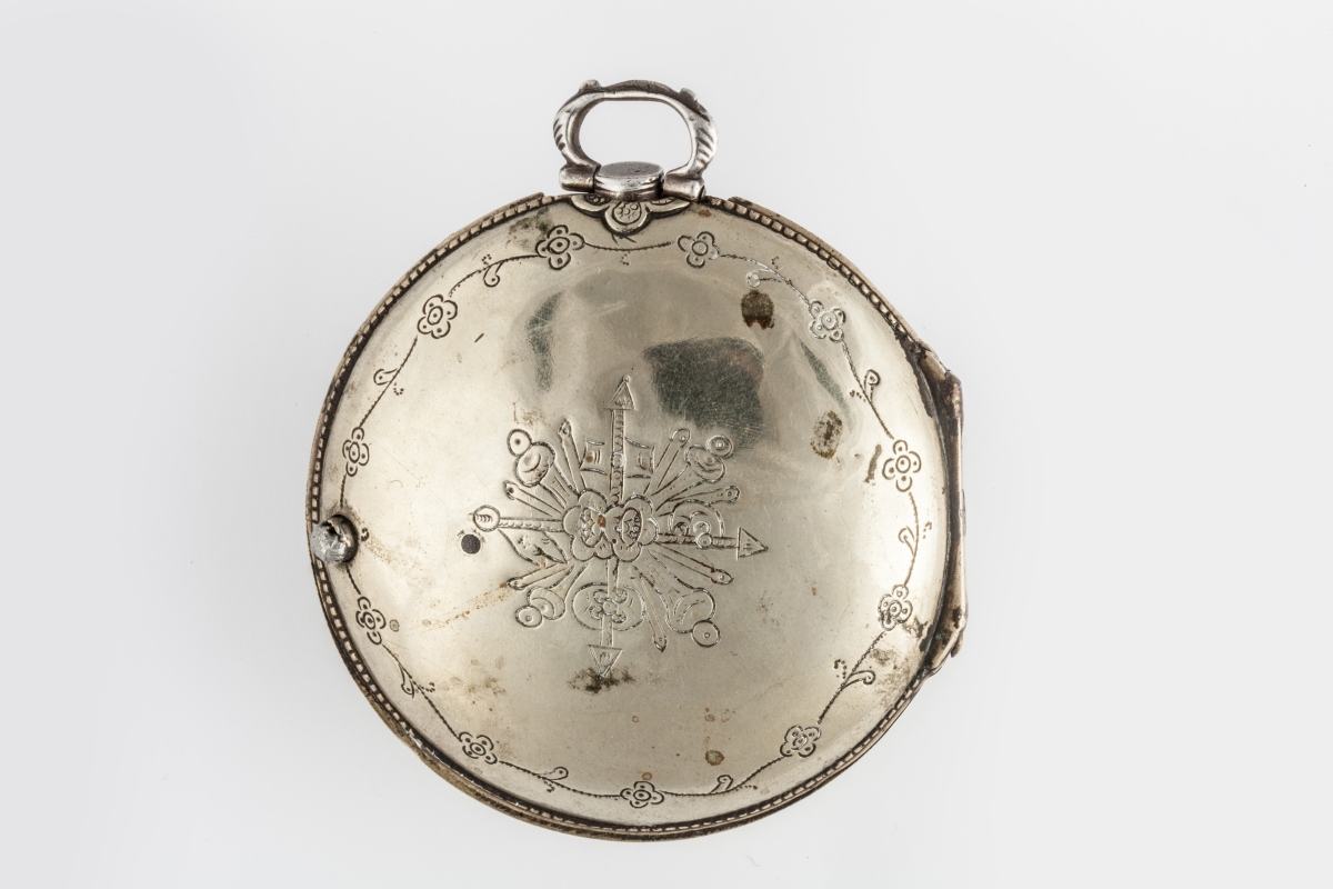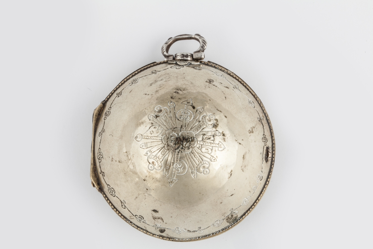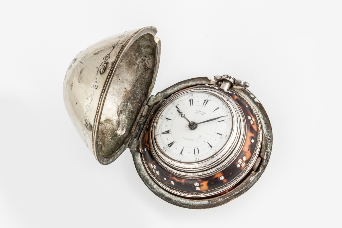 Quadruple BOITIER. Le plus petit en argent lisse, avec une lunette ornée d'un verre bombé et une bélière. Le deuxième en argent gravé. Le troisième en écaille de tortue rehaussée de clous d'argent. Le plus grand bombé en argent gravé de trophées.