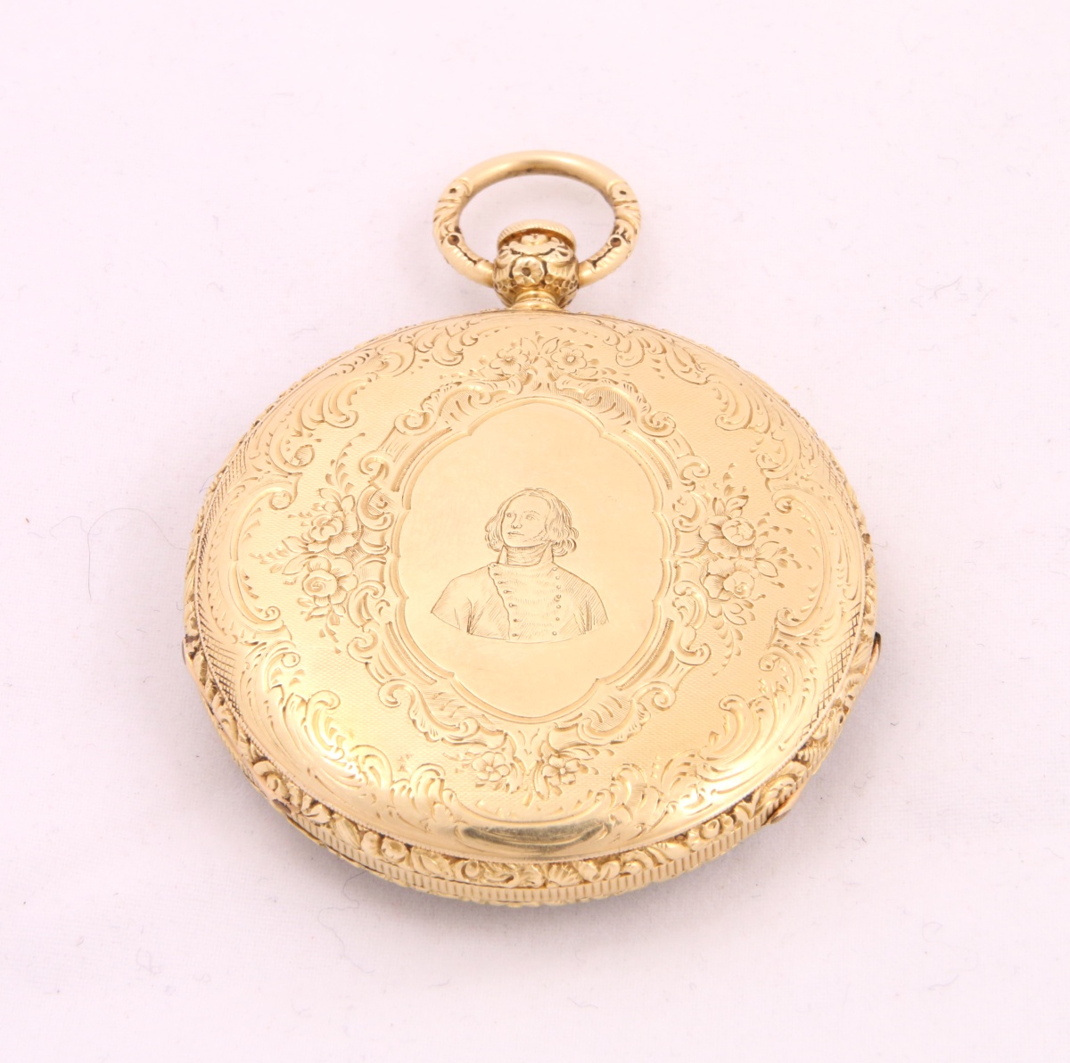 MONTRE de GOUSSET à sonnerie, à clef, en or jaune. Le dos centré d'un cartouche gravé d'un portrait en buste du général Lazare Hoche dans un riche encadrement de rinceaux. Cache-poussière marqué "Echappement à cylindre / Huit / trous en rubis". Cadran émaillé blanc indiquant les heures en chiffres romains.