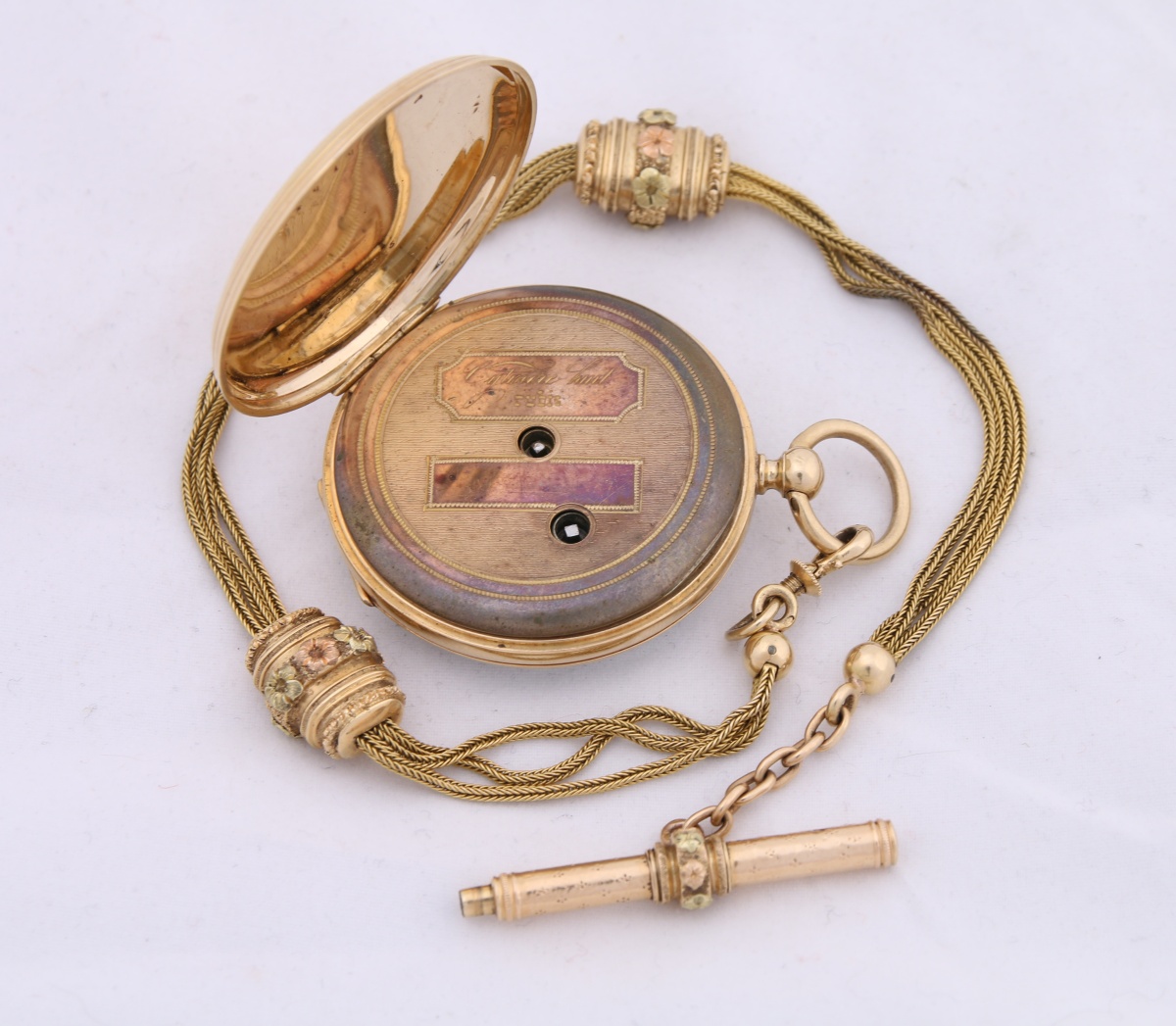 MONTRE d'homme en or, remontoir à clé. Et sa châtelaine à deux coulissants en or de deux tons. Fin XIXe.