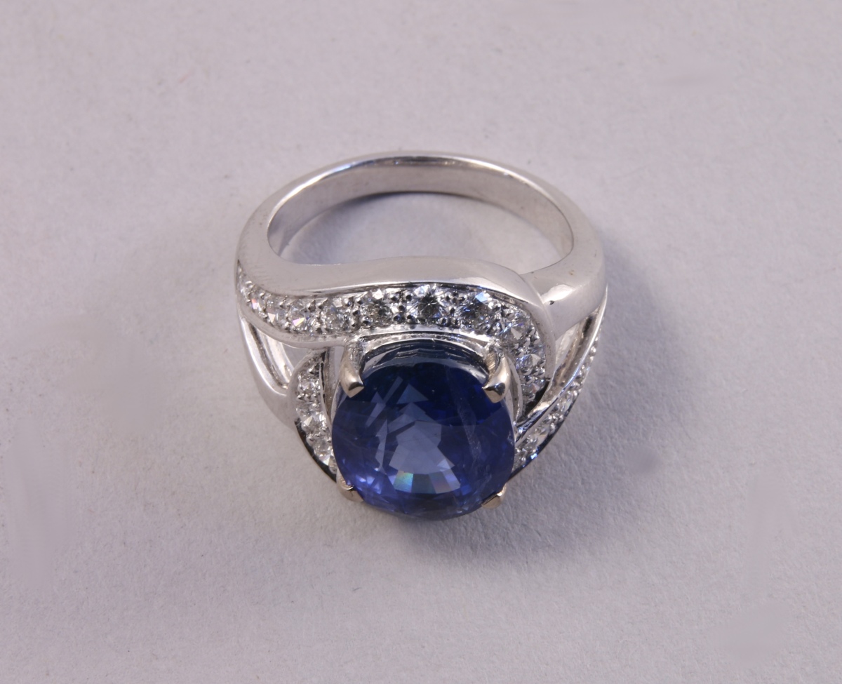 BAGUE tourbillon en or blanc ornée d'un important SAPHIR (probablement de Ceylan) taille ovale de 8,33 carats agrémenté de 22 diamants blancs taille moderne d'environ 0,90 carat.