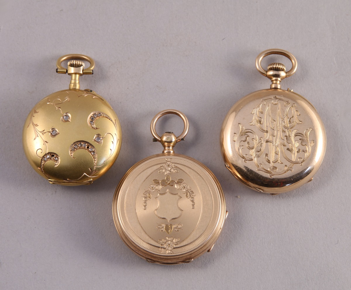3 MONTRES de COL en or jaune, deux à remontoirs...