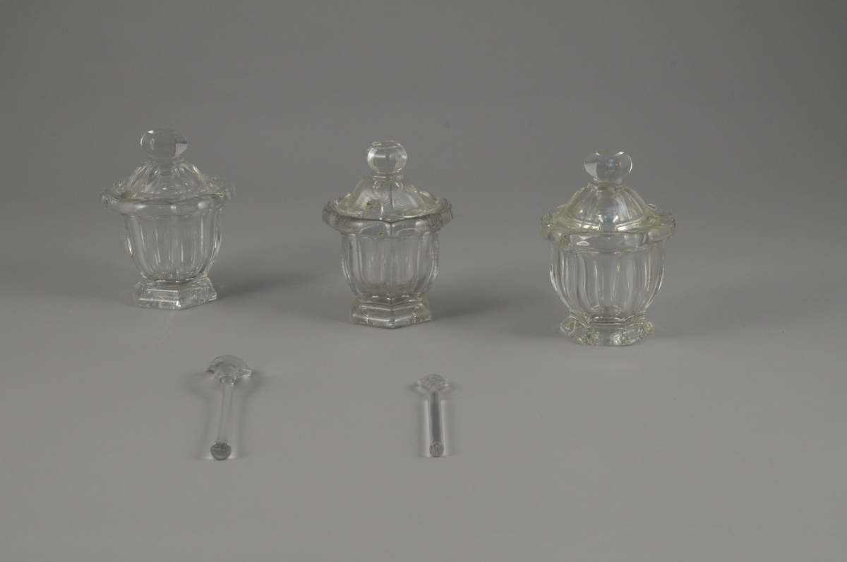 BACCARAT. 3 MOUTARDIERS "HARCOURT" en cristal. Haut. 10 cm.