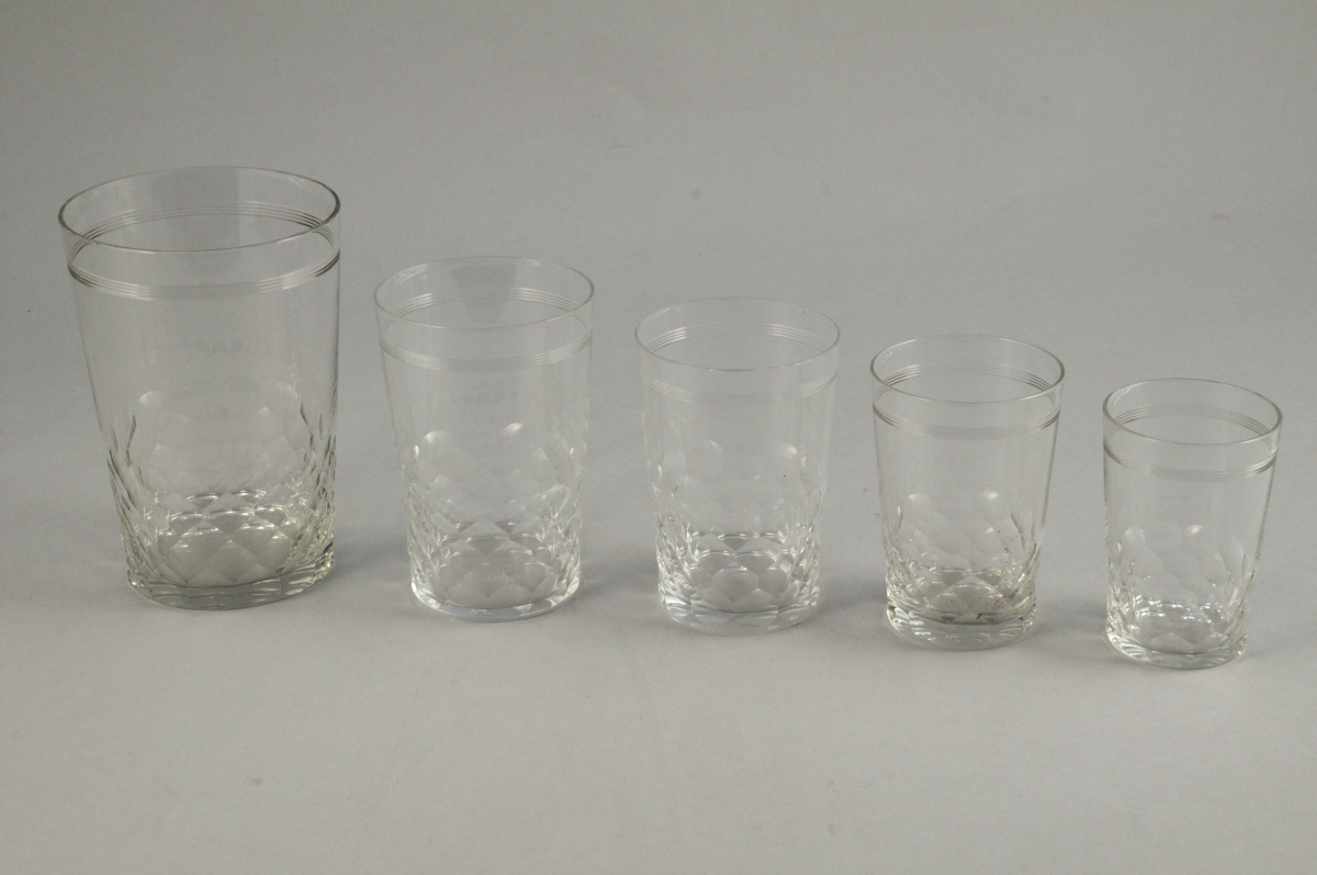 BACCARAT. SERVICE DE VERRES "CHAUNY", 63 pièces, en cristal taillé d'écailles et de filets : 9 choppes et 54 gobelets en 4 tailles (13 de 10,5 cm, 18 de 9,5 cm, 11 de 9 cm et 12 de 8 cm).
