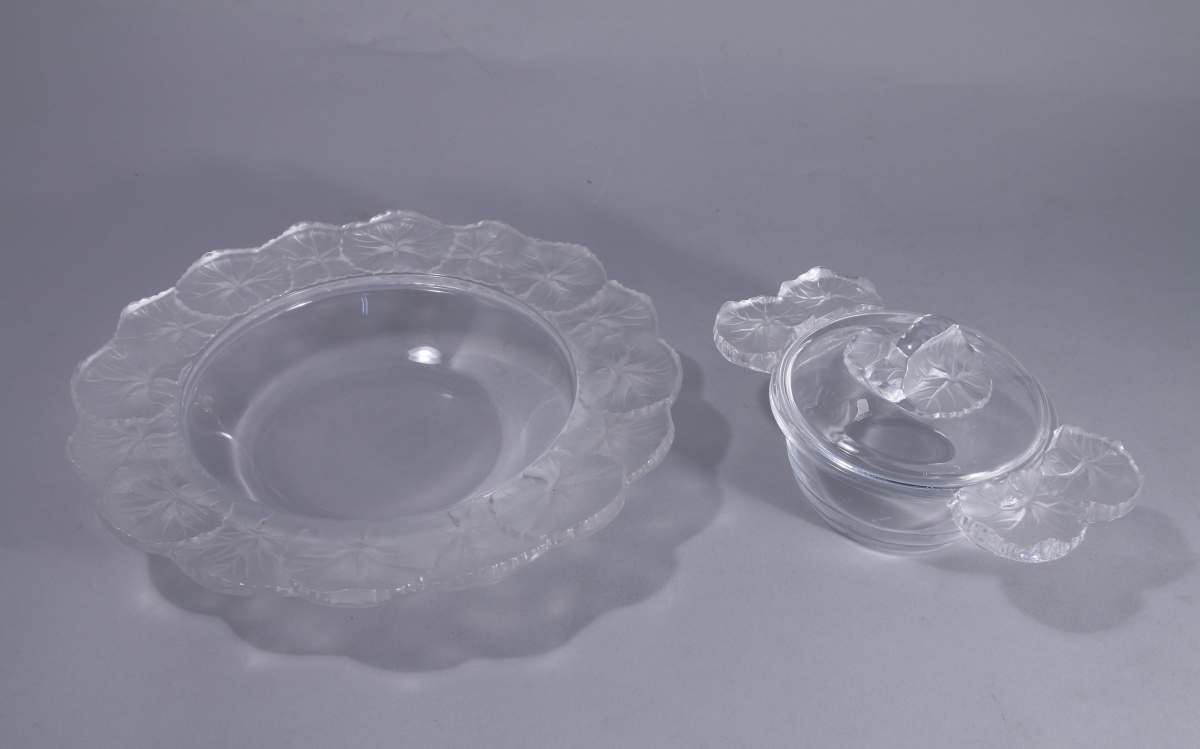 LALIQUE. ÉCUELLE à OREILLE et son ASSIETTE " HONFLEUR" en cristal blanc, signés Lalique France.