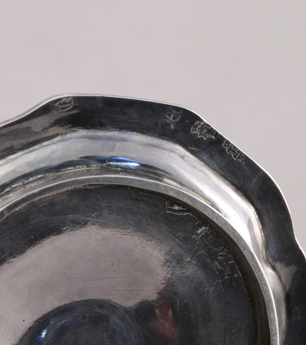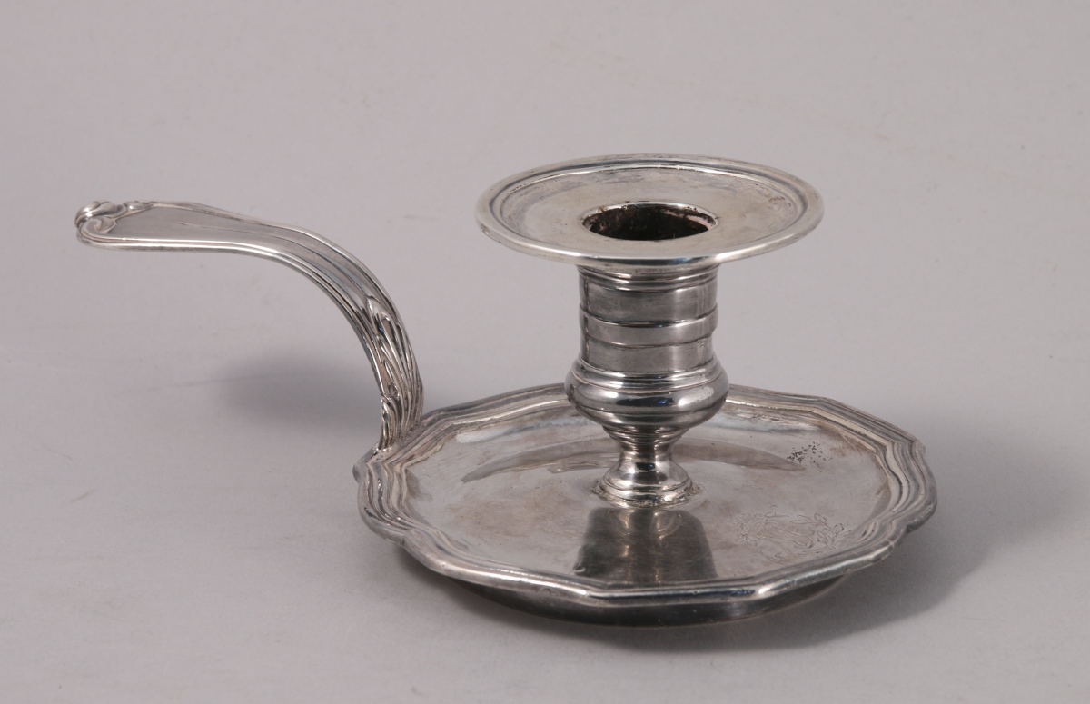 LA ROCHELLE. BOUGEOIR à main en argent, le plateau de forme chantournée à filets-contours. Le binet tourné orné de filets, la bobèche soudée. La spatule du manche à enroulements flanquant un grain de café. Attache agrémentée d'une feuille lancéolée.