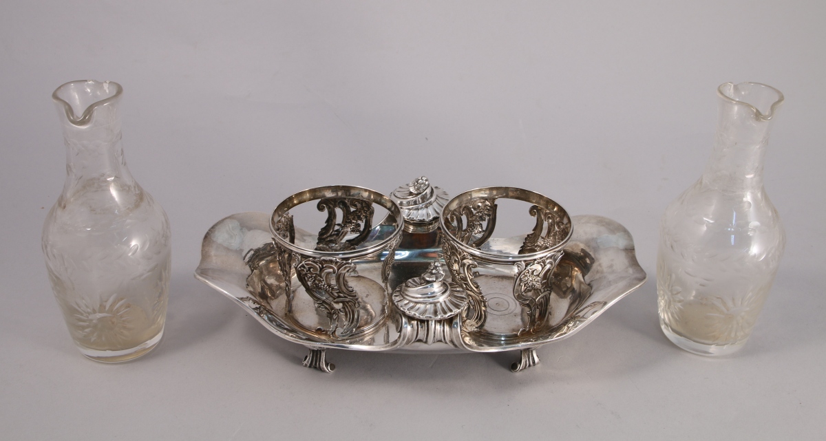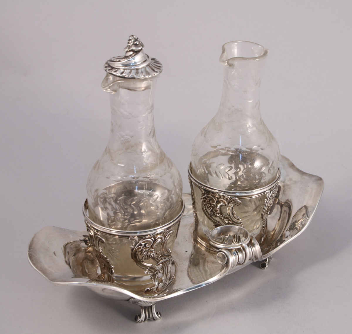 PARIS. HUILIER-VINAIGRIER de forme oblonge en argent. Le bassin à bords chantournés est orné d'enroulements à la hauteur des repose-bouchons. Il repose sur quatre pieds à attaches coquille. Les porte-carafons reçoivent un décor ciselé et ajouré d'agraphes, pampres de vigne et acanthes stylisées. Avec ses deux bouchons garnis de liège à fretel fugurant une grappe de raisin.
