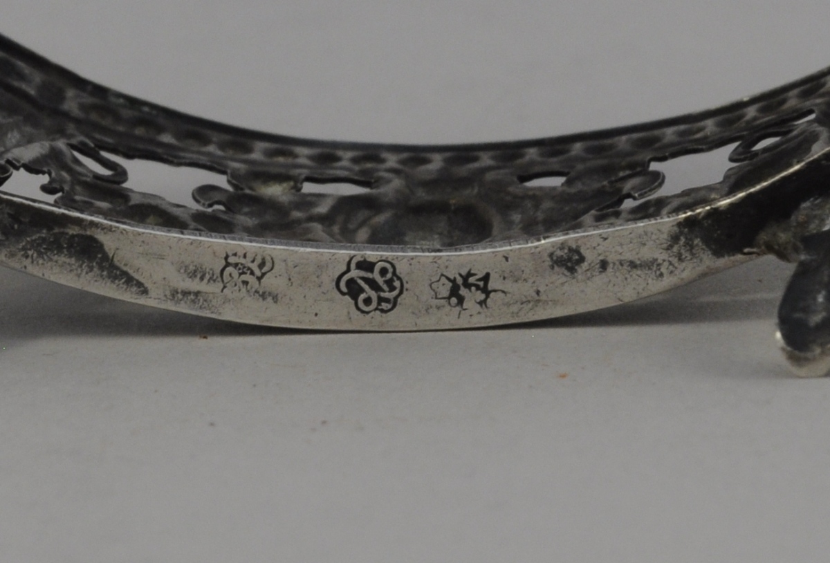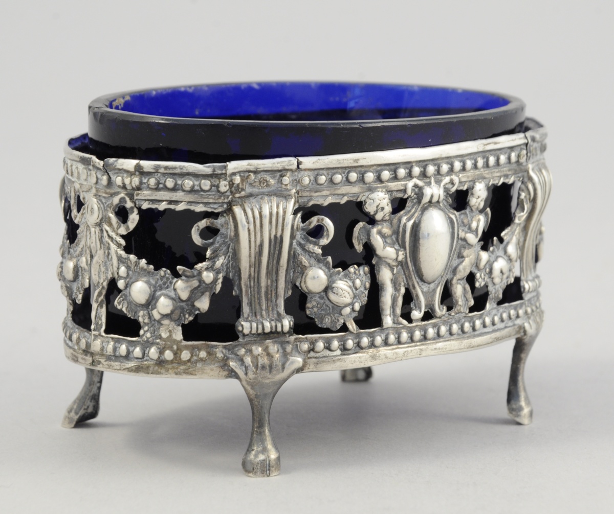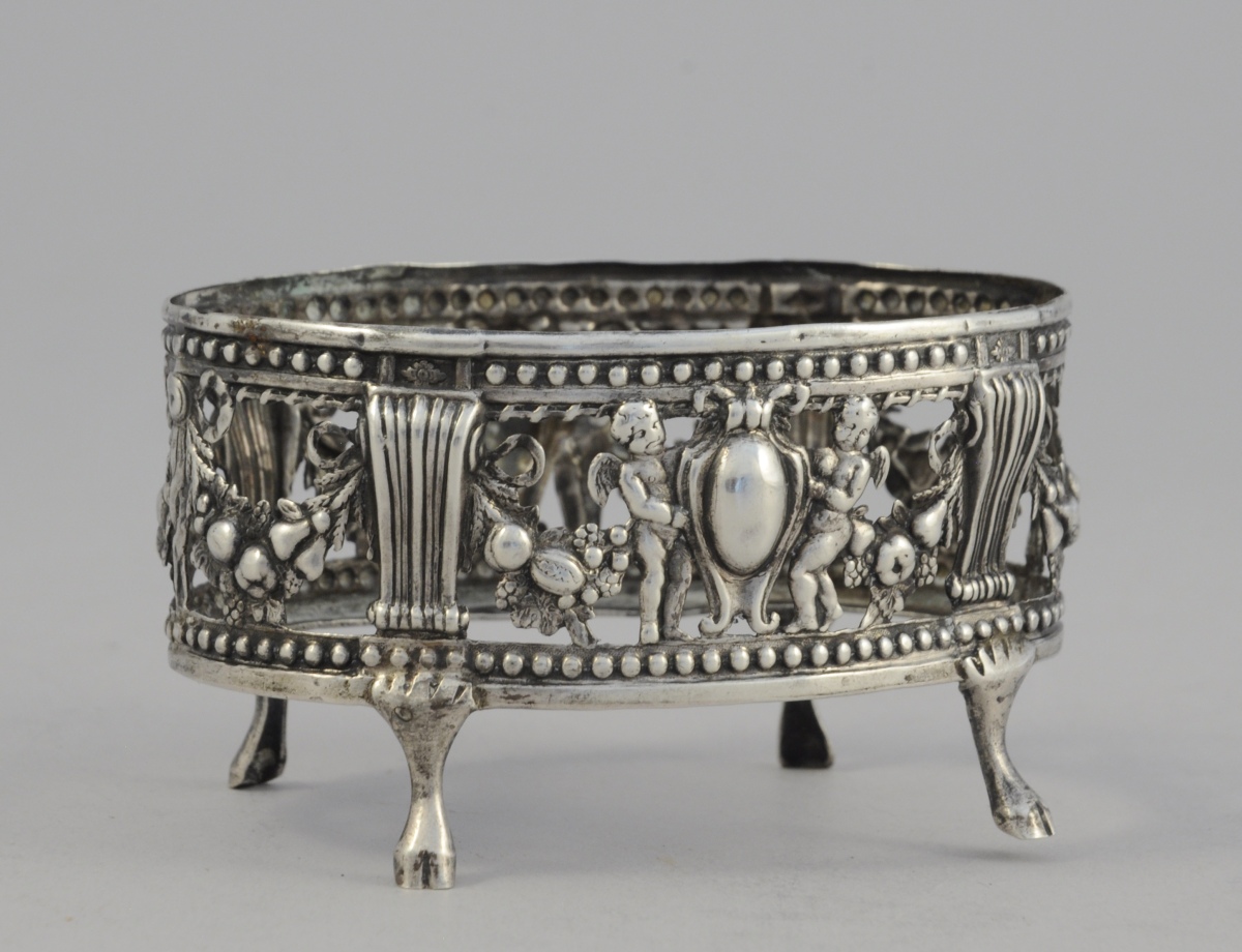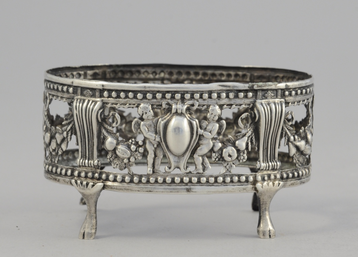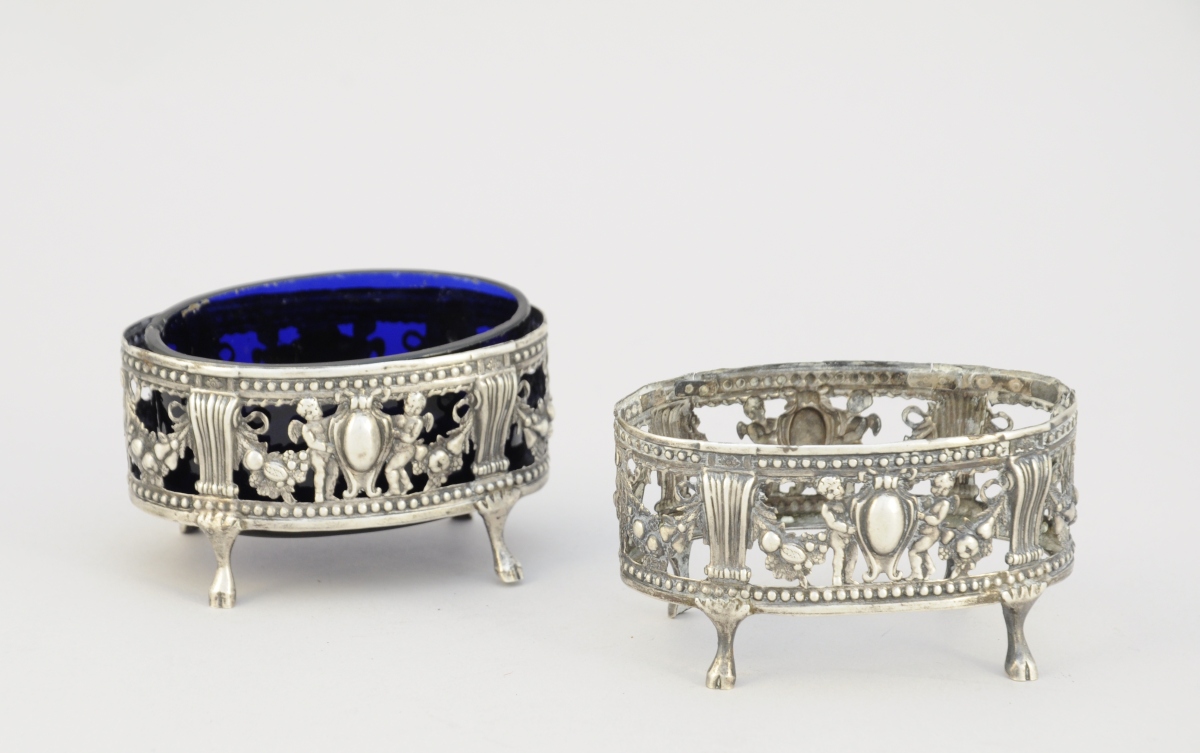PARIS. Paire de SALERONS en argent de forme ovale à décors repoussé et ajouré de rais de perles, guirlandes de fruits, amours, médaillons et consoles cannelées. Ils reposent sur quatre pieds sabot galbés.