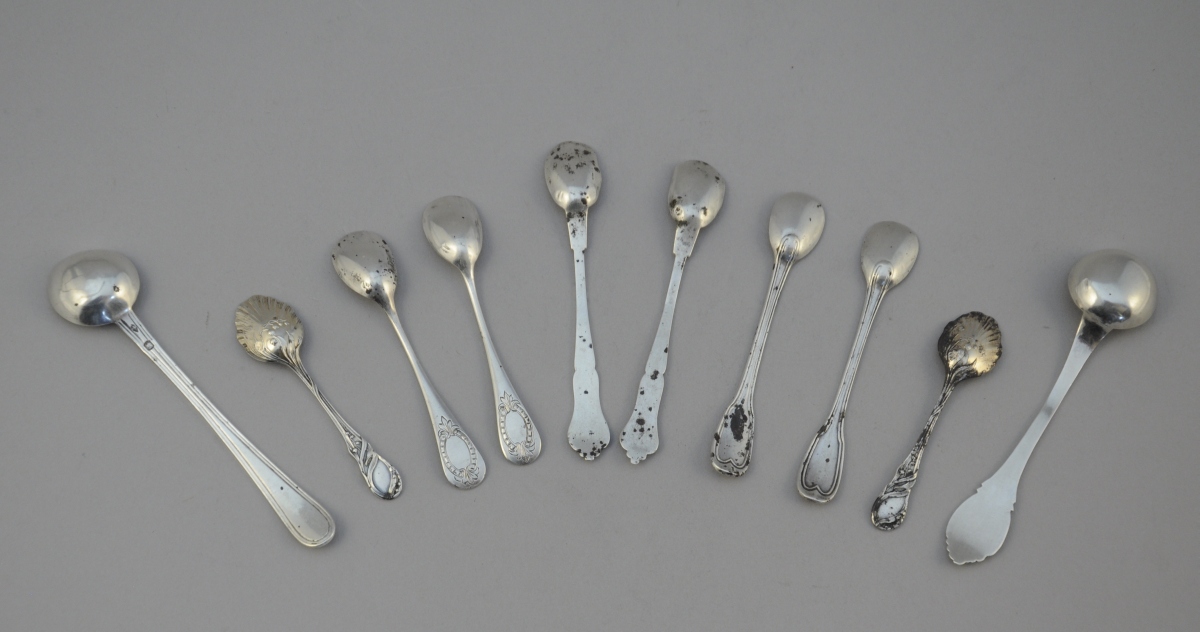 - 4 PAIRES DE PELLES À SEL et 2 CUILLÈRES À MOUTARDE en argent, divers modèles. Poinçon Minerve, XIX-XXe. Poids total : 65 g.