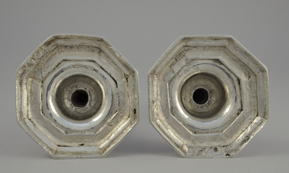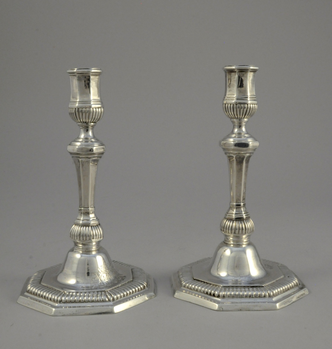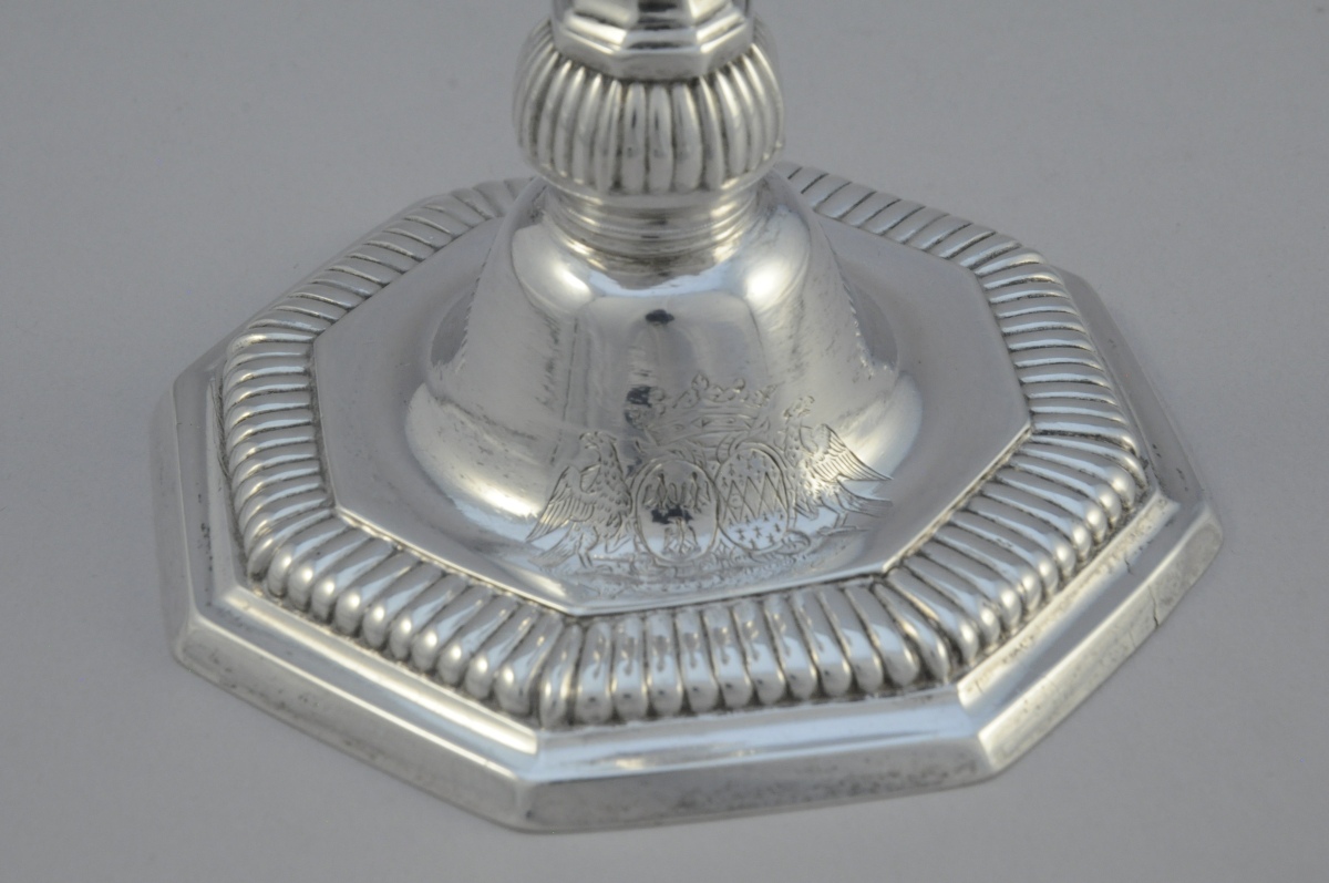 RENNES. PAIRE de FLAMBEAUX DE VOYAGE en argent reposant sur une base octogonale à décor de godrons. Elle est gravée d'armes d'alliance supportées par des aigles et timbrées d'une couronne de marquis. L'écu à senestre est aux armes de la famille d'Andigné. La base du binet et du fût à pans coupés est également ornée de godrons.