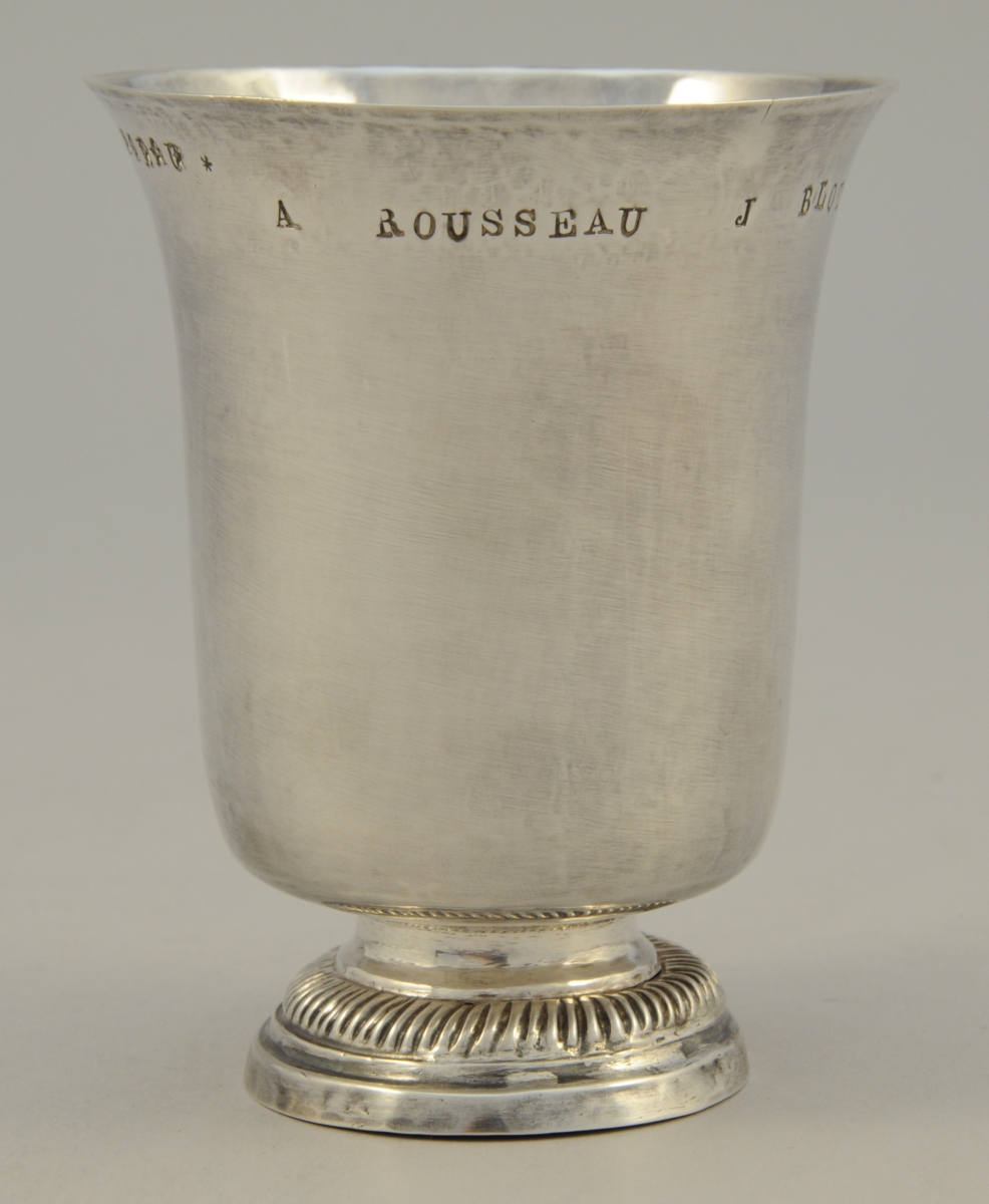 TOURS. TIMBALE dite TULIPE en argent uni reposant sur un piédouche. Le col martelé marqué "A ROUSSEAU J BLOT" porte une inscription biffée.