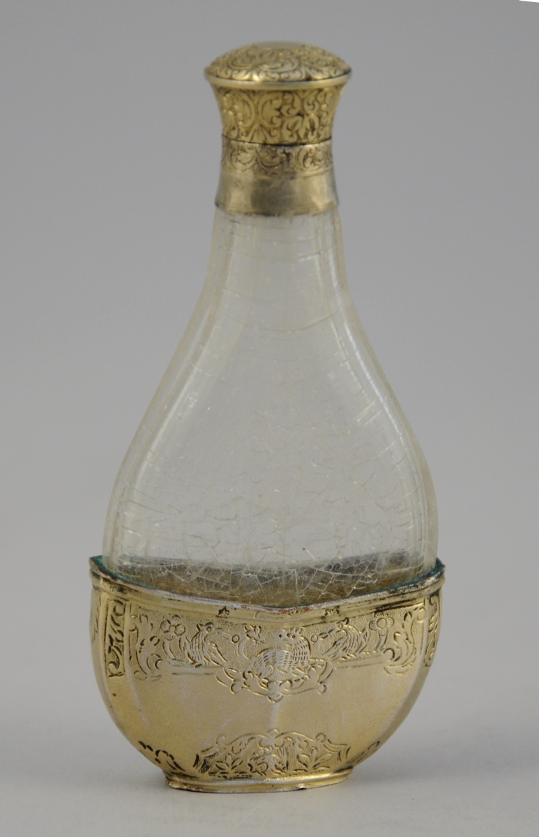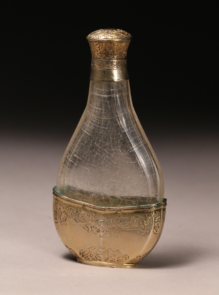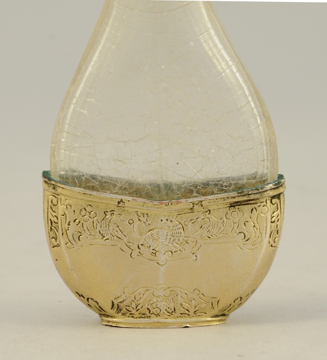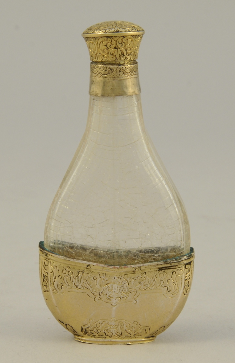 FLACON à parfum, réceptacle en cristal de roche (?). Bouchon et monture envermeil gravé de scènes d'oiseaux et de lapins.