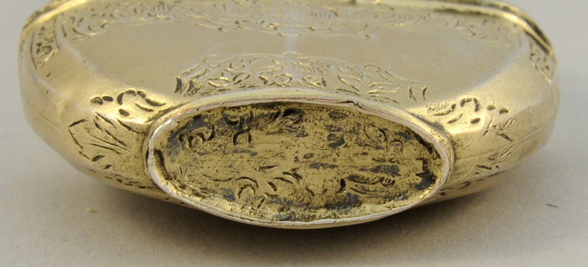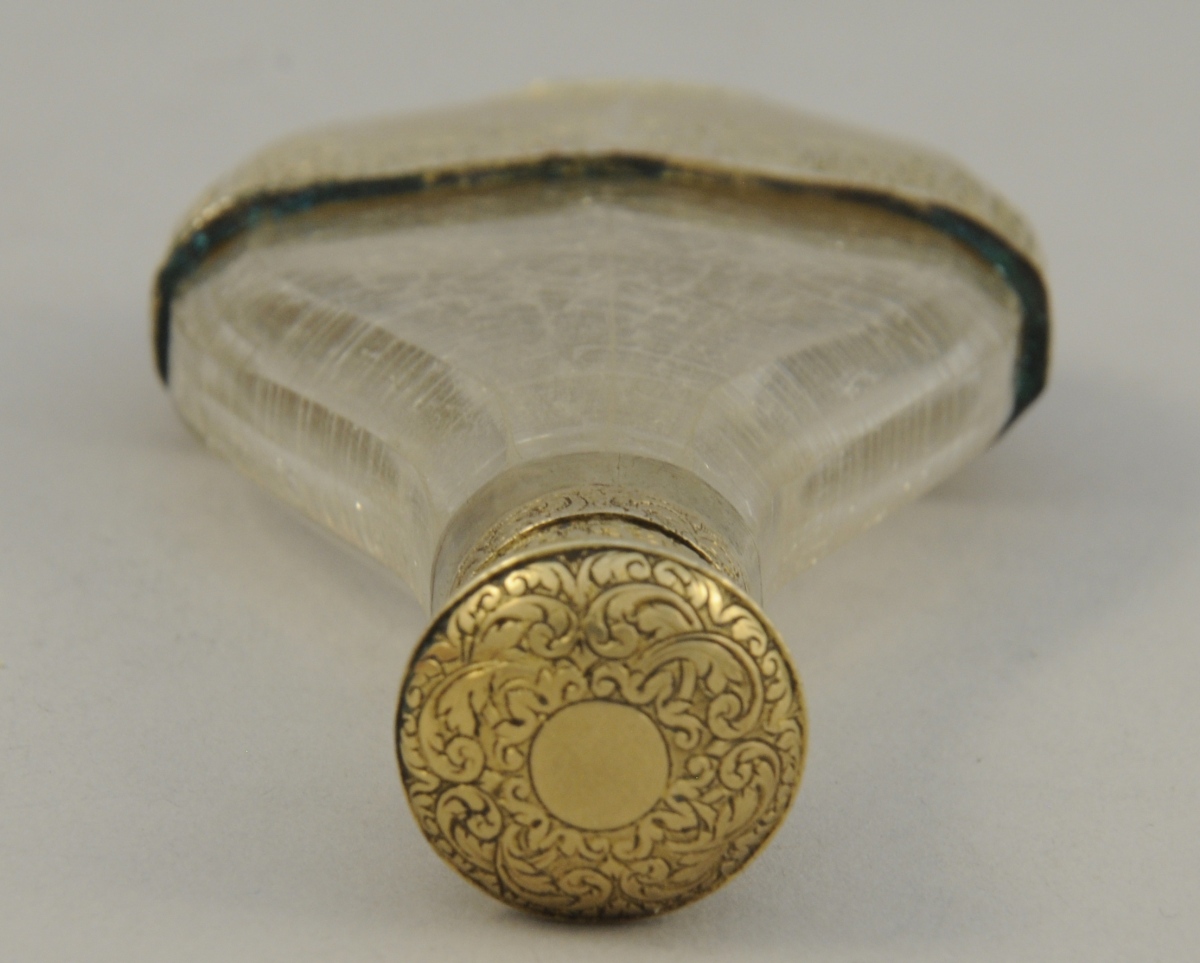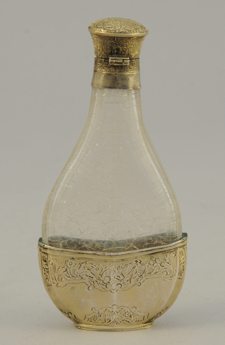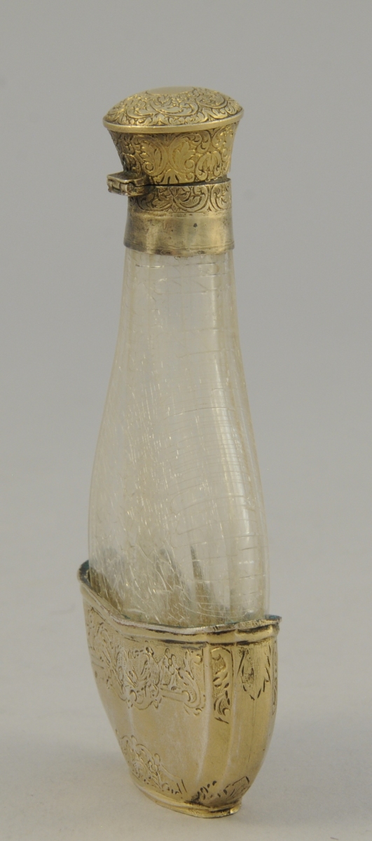 FLACON à parfum, réceptacle en cristal de roche (?). Bouchon et monture envermeil gravé de scènes d'oiseaux et de lapins.