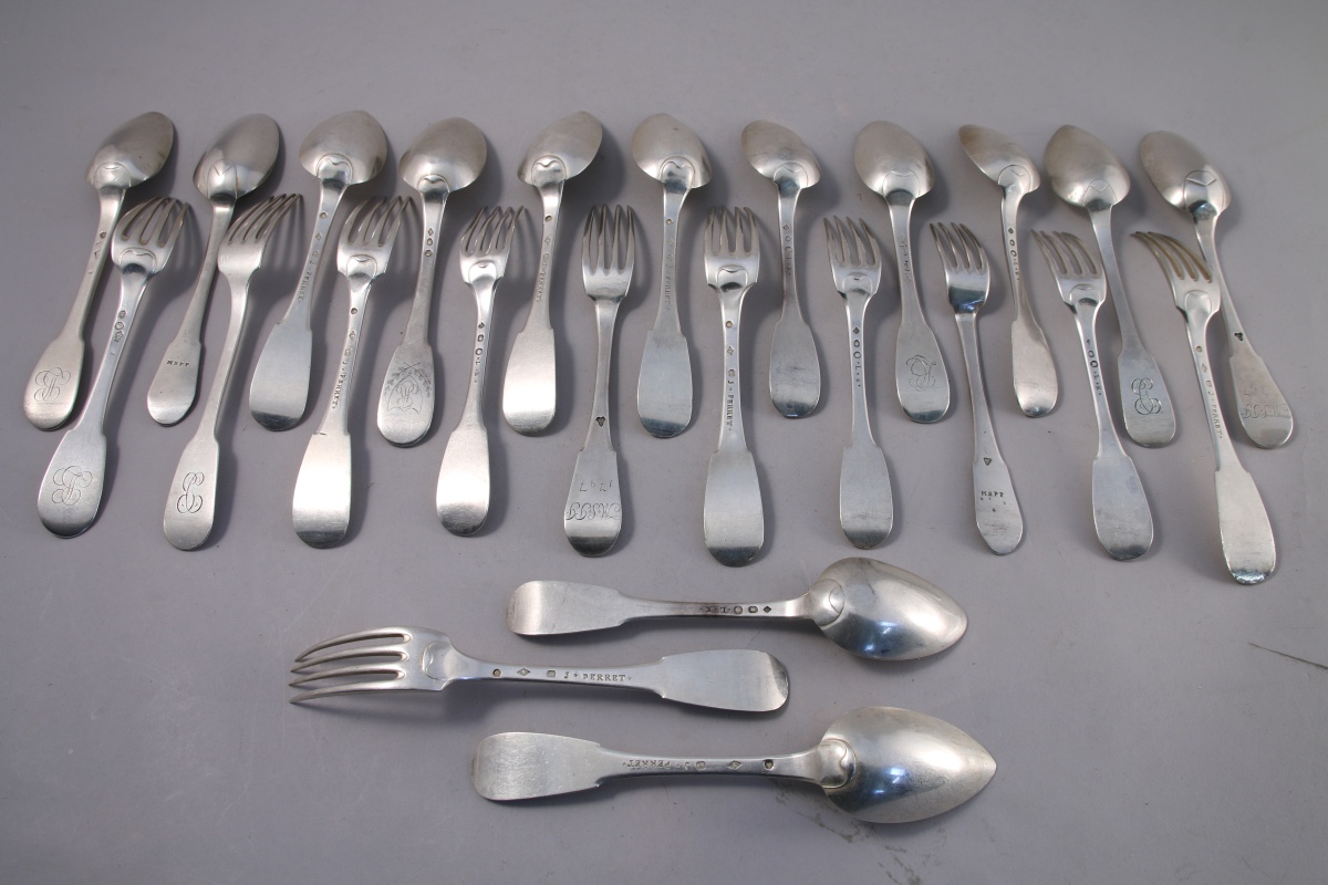 11 COUVERTS DE TABLE + 2 CUILLÈRES DE TABLE en argent, modèle uniplat. Divers orfèvres. Poinçons XVIIIè aux Fermiers Géneraux et XIXè principalement Coq. Poids ensemble 1.590 g.