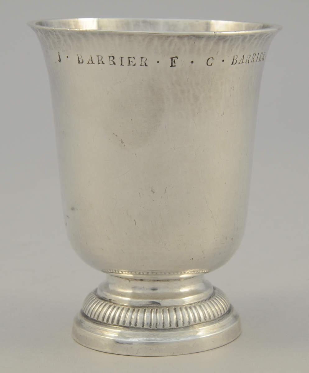 TIMBALE dite TULIPE en argent uni et martelé au col reposant sur un piédouche orné d'une frise de godrons. Marquée "J . BARRIER . F . C . BARRIER .".