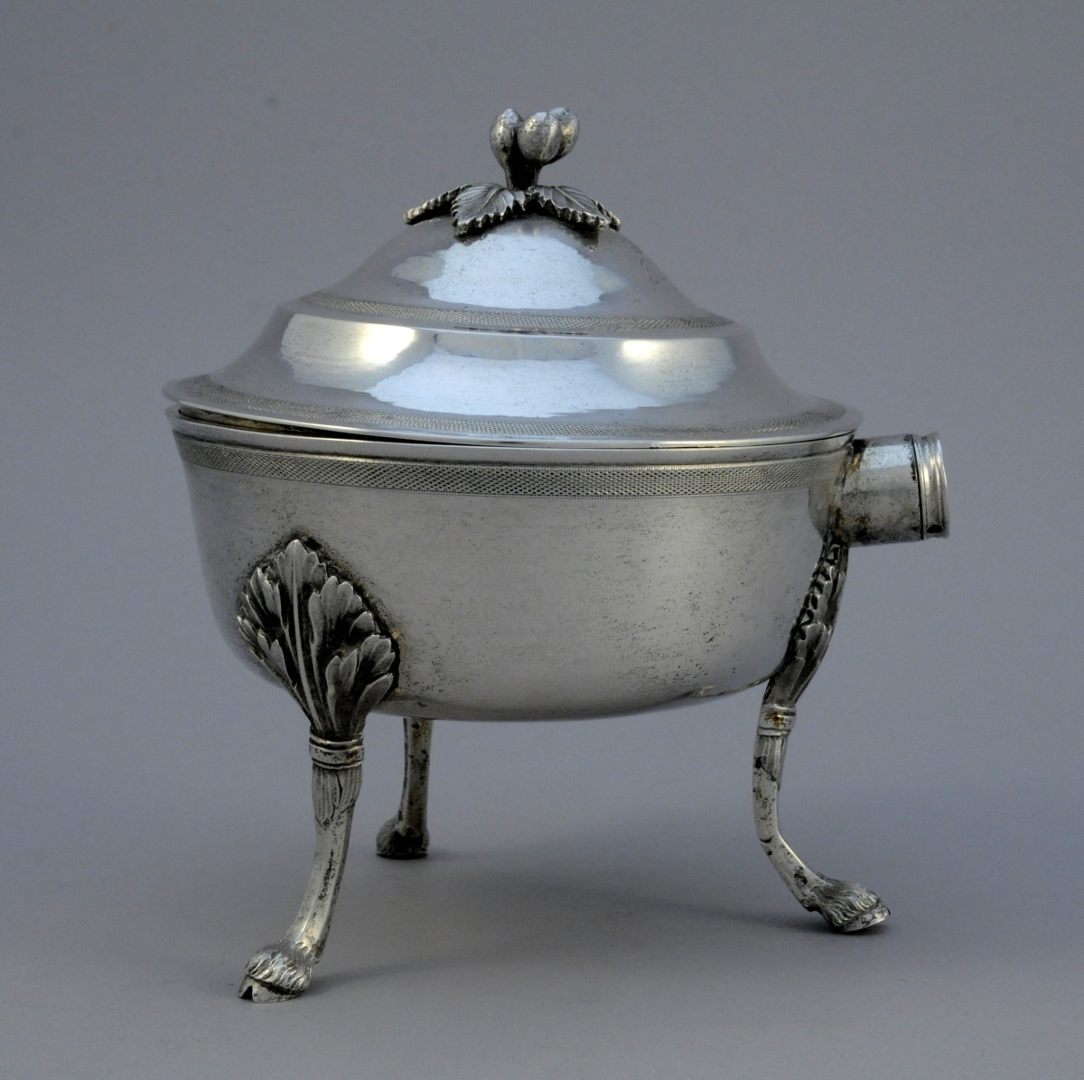 POÊLON COUVERT en argent orné de frises quadrillées. Il repose sur trois pieds sabots à attaches en feuille d'acanthe. Fretel figurant trois graines sur une terrasse feuillagée. Gravé du monogramme "P.M." timbré d'une couronne.