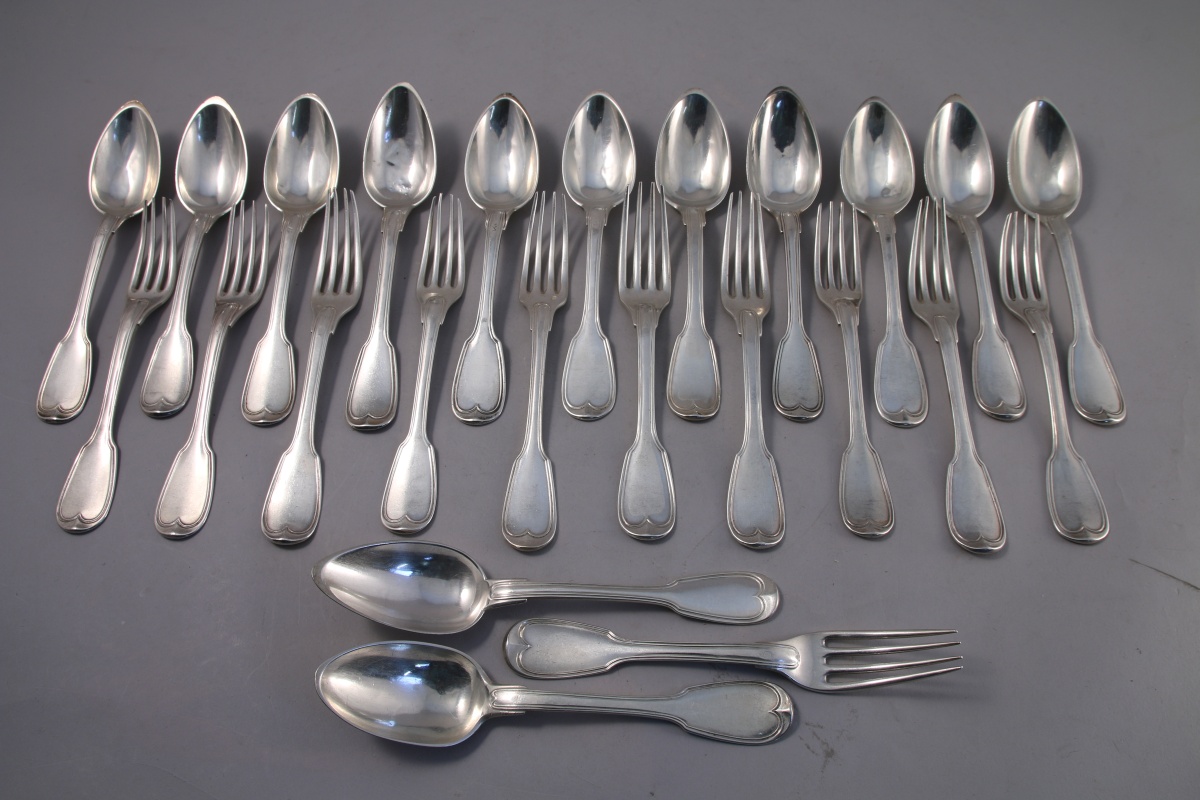 11 COUVERTS DE TABLE + 2 CUILLÈRES DE TABLE en argent, modèle filets. Divers orfèvres. Poinçons 1er et 2eme Coq, Vieillard, Minerve (1). 1797-1838.